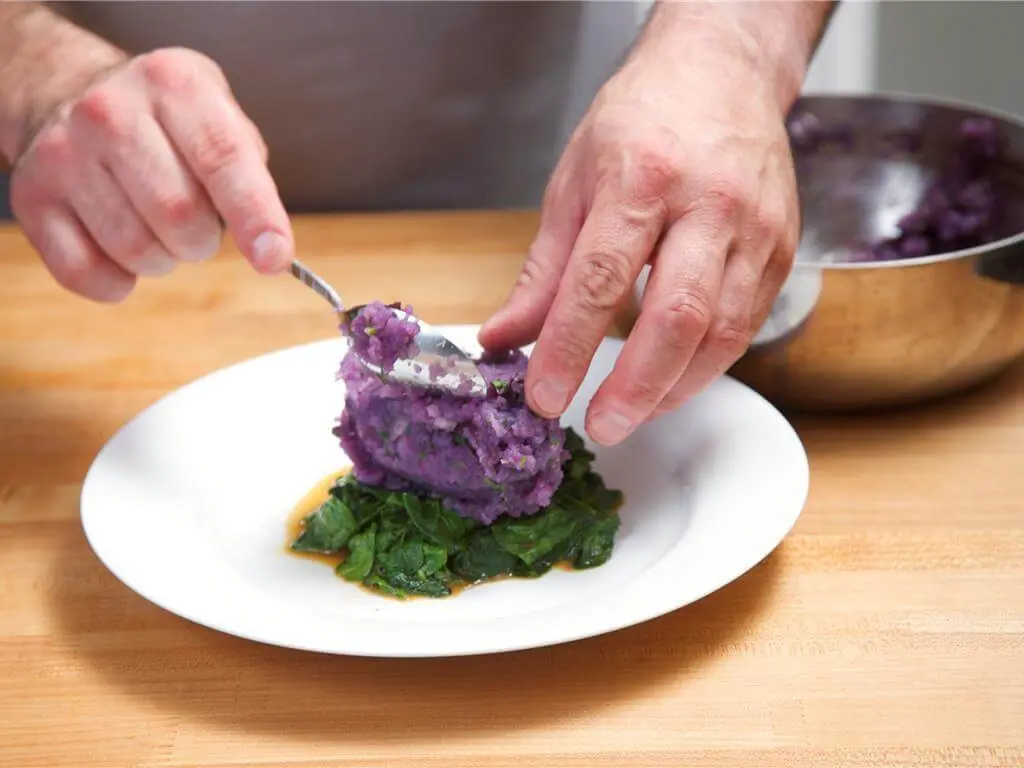 Plate a bed of wilted spinach in the center of 2 plates. Place smashed potato in the center of the top of the spinach with height.