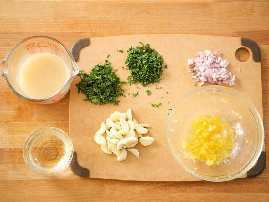 In a bowl, stir Chicken Base (1 pckg) with 1 cup of warm water. Slice the Garlic (20 cloves) in half lengthwise. Finely chop the Shallot (1). Finely chop Fresh Parsley (3 Tbsp), into a bowl. Juice Lemon (1) into the bowl with zest.