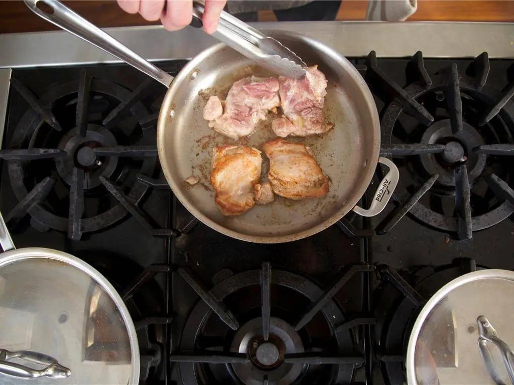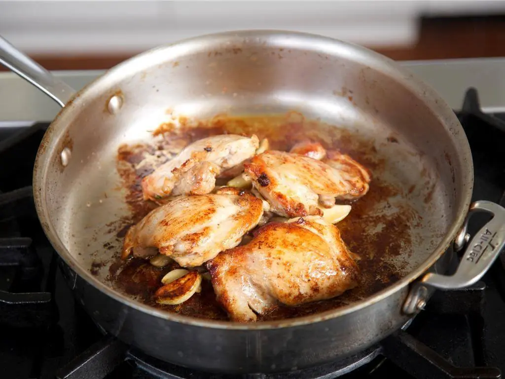 Reduce heat to medium. Bury the garlic cloves under the chicken. Cook for 5 minutes until garlic begins to brown.