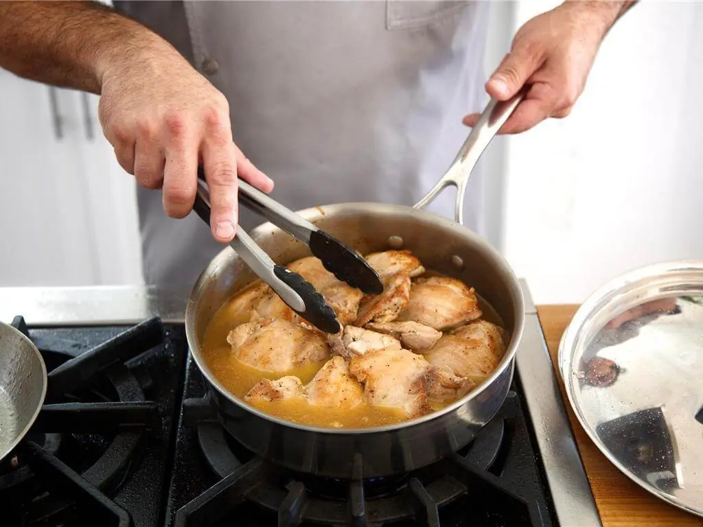 Add White Cooking Wine (1/2 cup) and chicken broth. Scrape the bottom of the pan to release any browned bits. Cover and let cook for 15 minutes. Chicken is done when meat easily pulls apart with a fork.