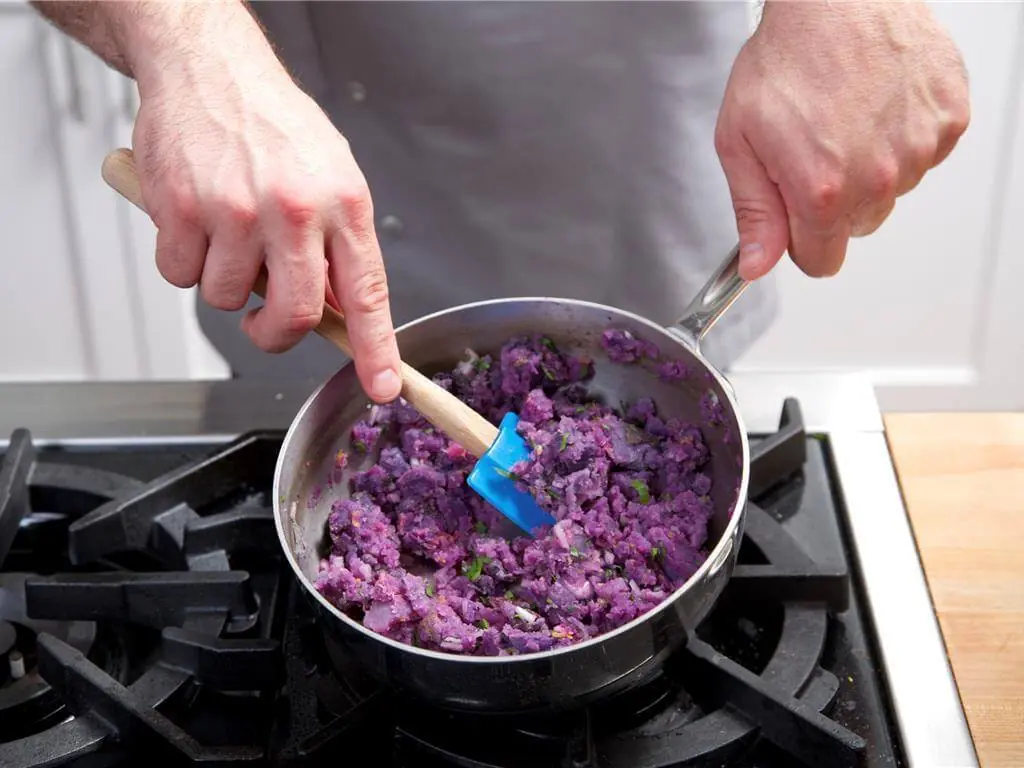 Place Purple Potatoes (2 1/4 cups) in a small saucepan and cover with cold water. Boil over high heat for 15-20 minutes or until fork tender. Drain. Place back into the saucepan and cover with lid to keep warm.