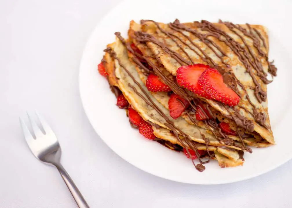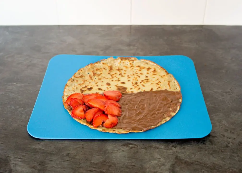 Slide the crepe out the pan and onto a chopping board or mat. Smear half the crepe with warmed Nutella or Biscoff. Top a quarter of the Nutella/Biscoff half with sliced strawberries.