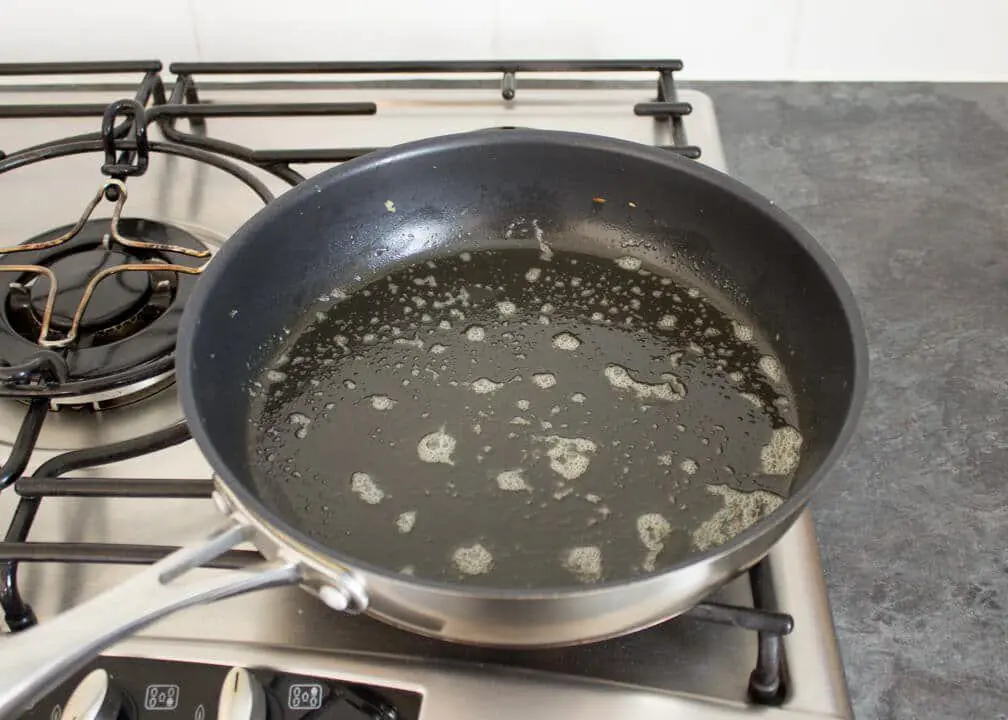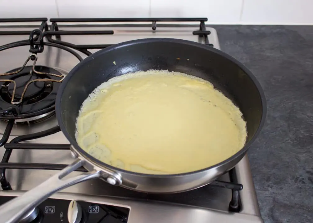 Get your pan nice and hot. Not so hot that it burns the butter, but hot enough that the batter starts bubbling ever so slightly when you pour it in. Add a small knob of Unsalted Butter (to taste) and allow to melt. Then swill it around to cover the whole pan.