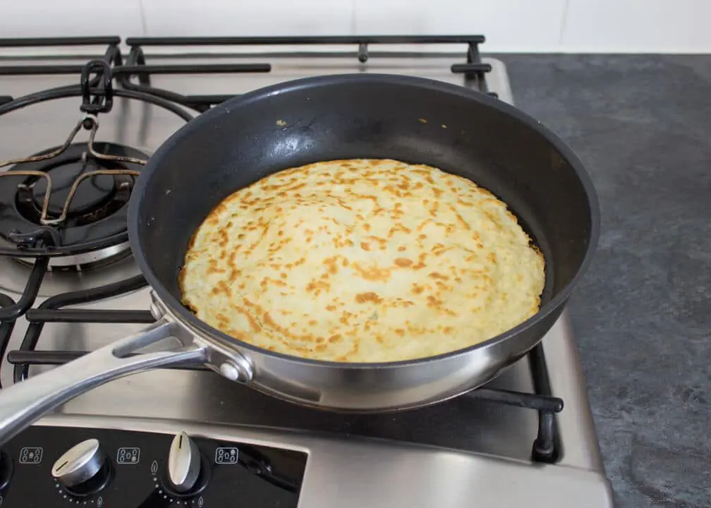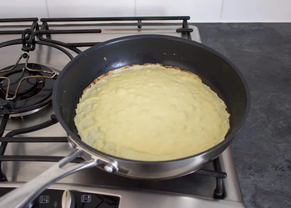 Allow to cook for a few minutes. If you’re pan is hot enough, it will start to bubble when it is ready to be flipped. But just keep an eye on it by lifting up an edge to check if it’s golden brown.