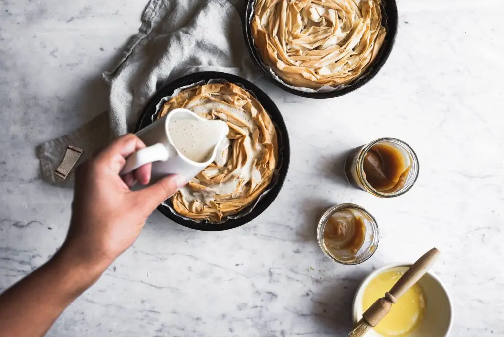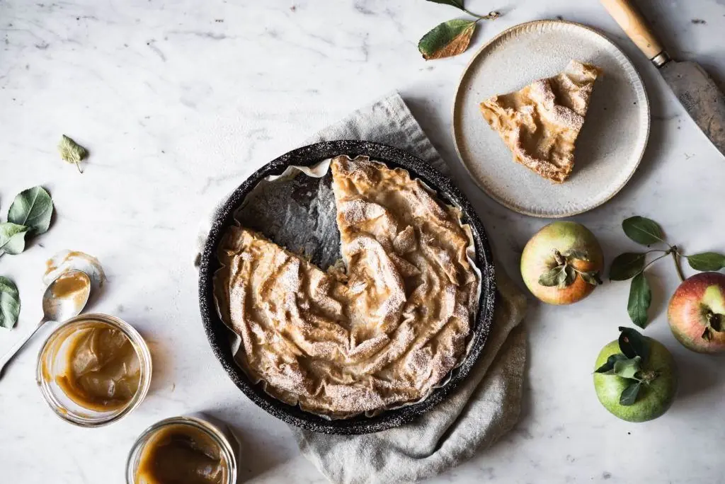 I have made a lot of ruffled milk pies in my time, but this apple butter version is probably our very favorite of them all. The combination of our favorite fall flavors with one of our most beloved Greek pastries is perfectly meant to be. The fact that this ruffled milk pie is one of the simplest pastries to put together makes it all the more wonderful!