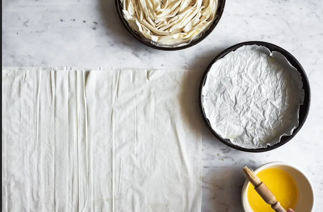 Place 1 sheet of Phyllo Dough (14 sheets) on a clean surface and brush it with Unsalted Butter (3/4 cup). Place another sheet of phyllo over the top of the first one and brush with butter. Use your fingers to scrunch up the phyllo long ways, into a loose ruffled strip (it's okay if the phyllo tears a bit).
