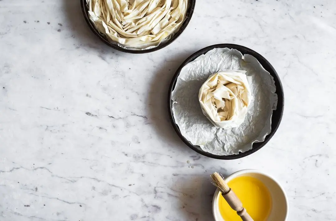 Brush the tops of the ruffled phyllo generously with the remaining butter. Bake in preheated oven for 20-25 minutes, until the phyllo is golden brown.
