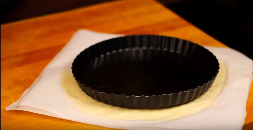 Take one of your chilled dough and roll it out between two parchment paper. Make sure to roll out about an inch larger than the tart pan itself. Let it chill in the fridge for 10 minutes to firm up before pressing it into the tart pan.