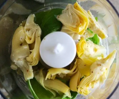 Place the Tahini (2 Tbsp), Fresh Basil Leaves (to taste), Salt (to taste), 4 tablespoons of liquid from chickpea can, Garlic (1 clove), and Marinated Artichokes (3/4 cup) in your mini food processor and puree.