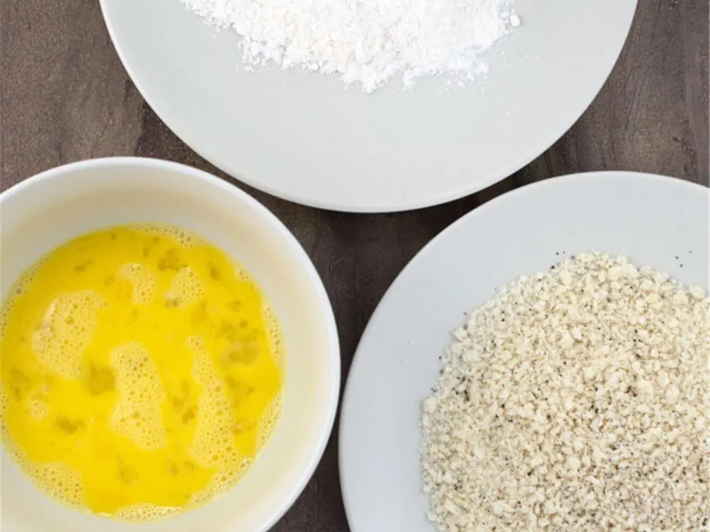 Begin by lining up a plate with All-Purpose Flour (4 Tbsp), a bowl with the beaten Eggland's Best Classic Egg (1), and a plate with the Panko Breadcrumbs (3/4 cup).