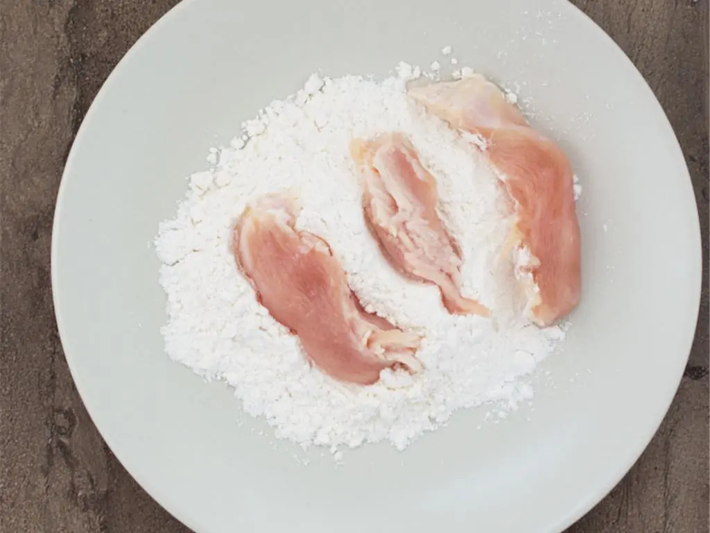 Coat chicken tenders in flour. Pound chicken with the palm of you hand while you are doing this. It will help the chicken cook evenly.