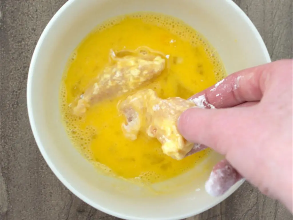 Place the floured chicken tenders in the egg mixture. Make sure to get the excess egg off before moving on to the next step.