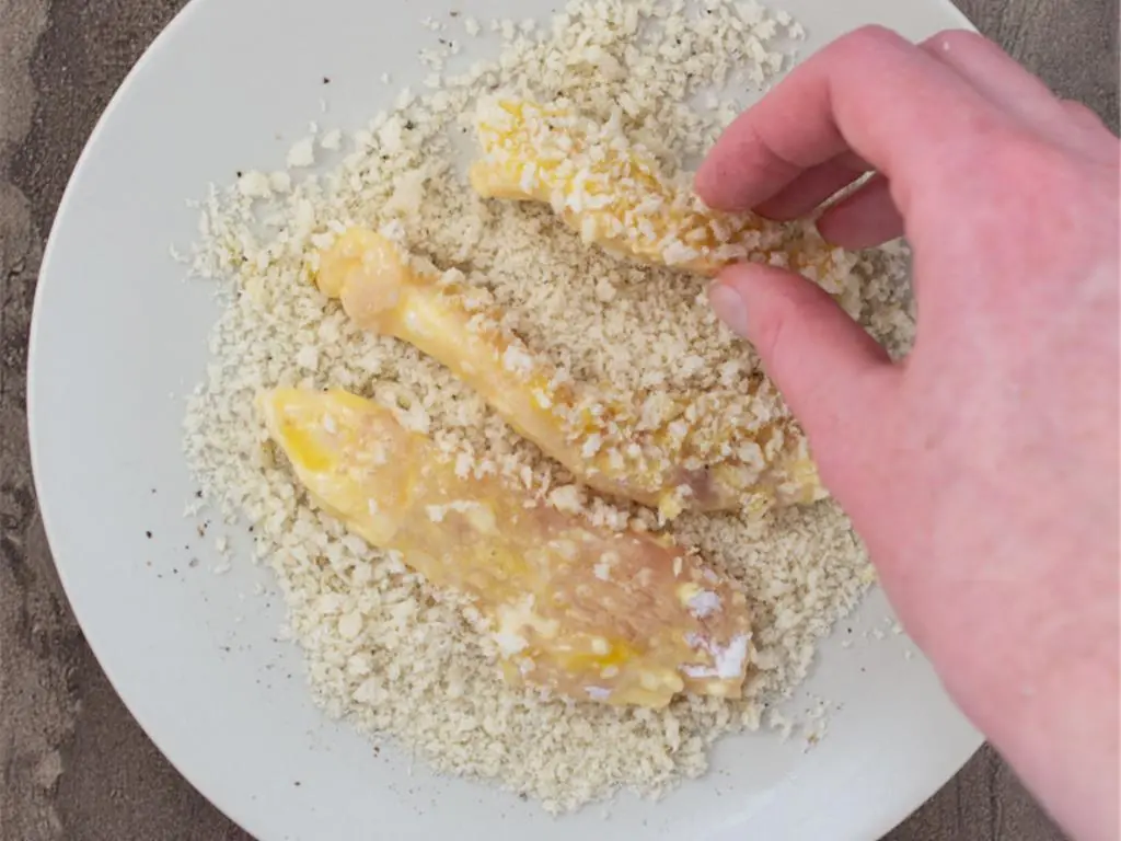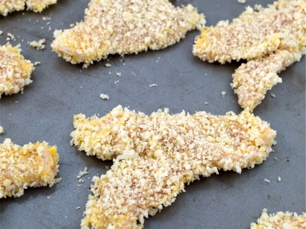 Coat the chicken tenders in the panko breadcrumbs, making sure to cover them completely.