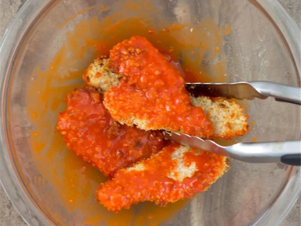In a medium bowl add Buffalo Sauce (1/2 cup) and chicken tenders, and toss with a pair of tongs until fully coated.
