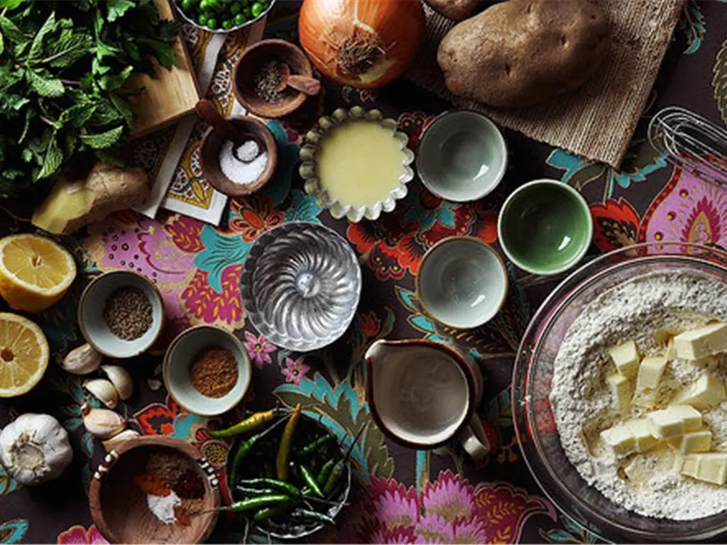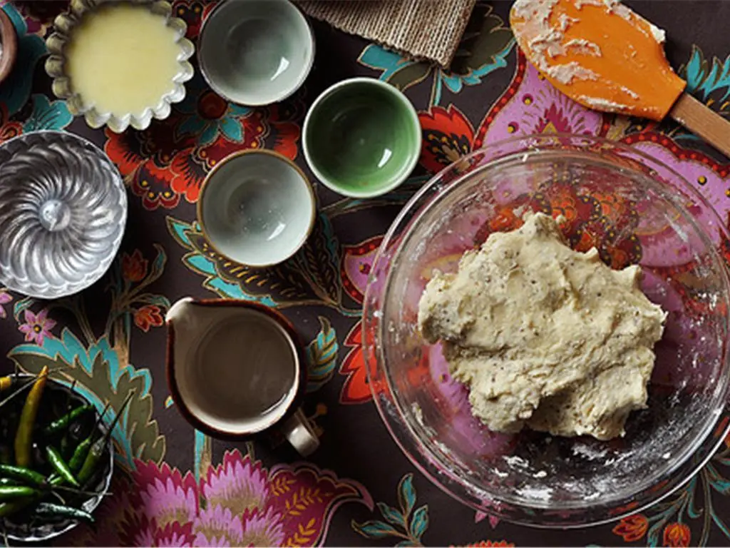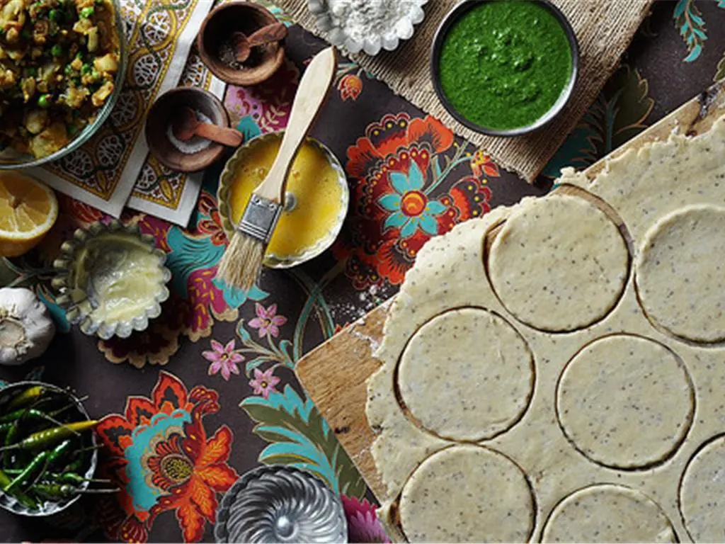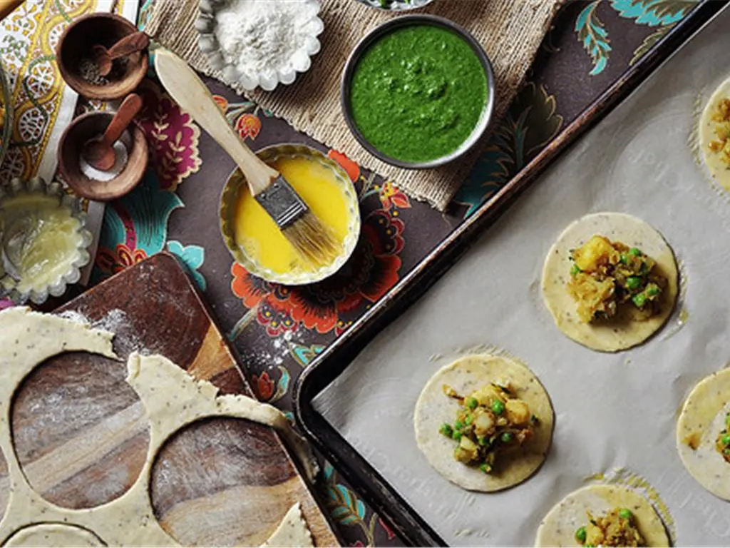 To make the crust: Mix together the All-Purpose Flour (1 1/2 cups), Granulated Sugar (1/2 tsp), Salt (1/2 tsp), and Ajwain Seeds (1 Tbsp) in a large mixing bowl. Add the Unsalted Butter (1/2 cup) and cut-in with a pastry blender or your fingers until it forms coarse crumbs the size of peas.