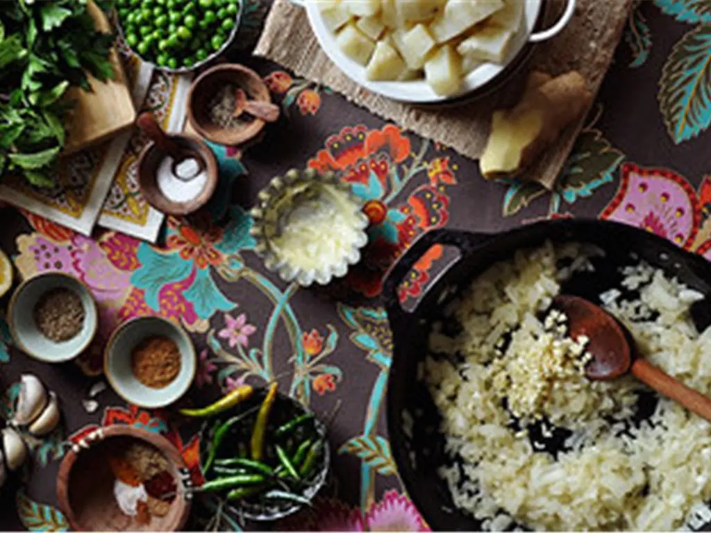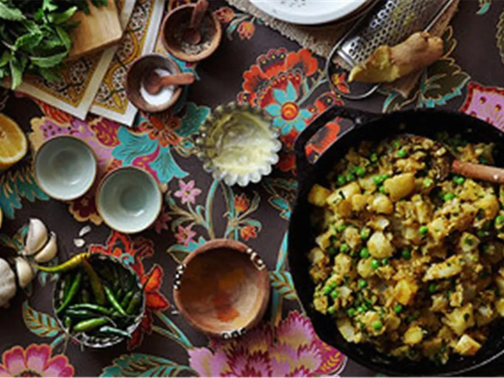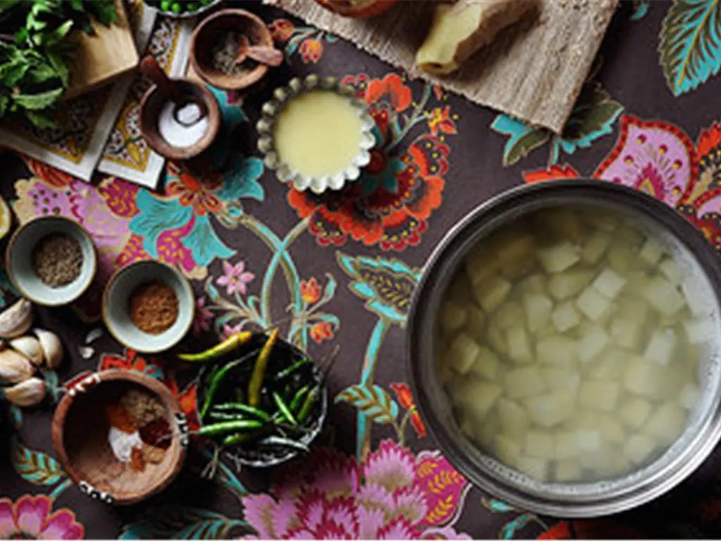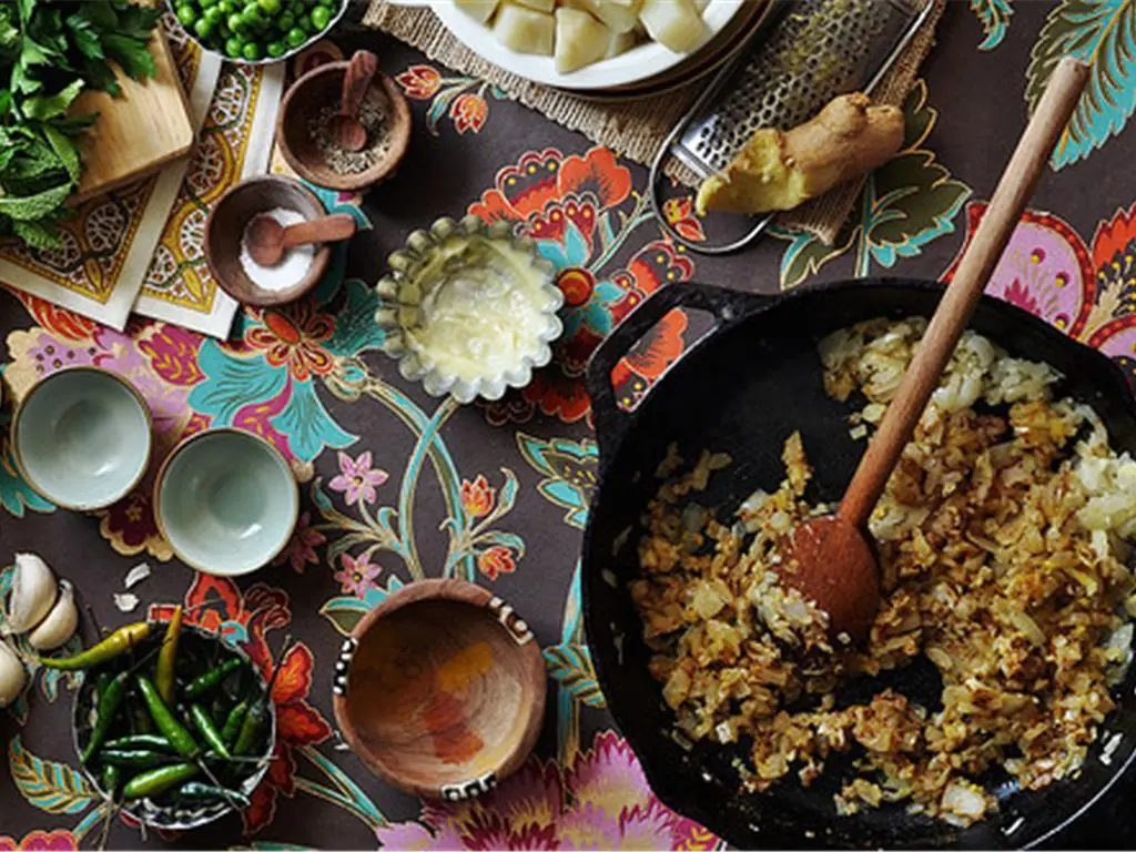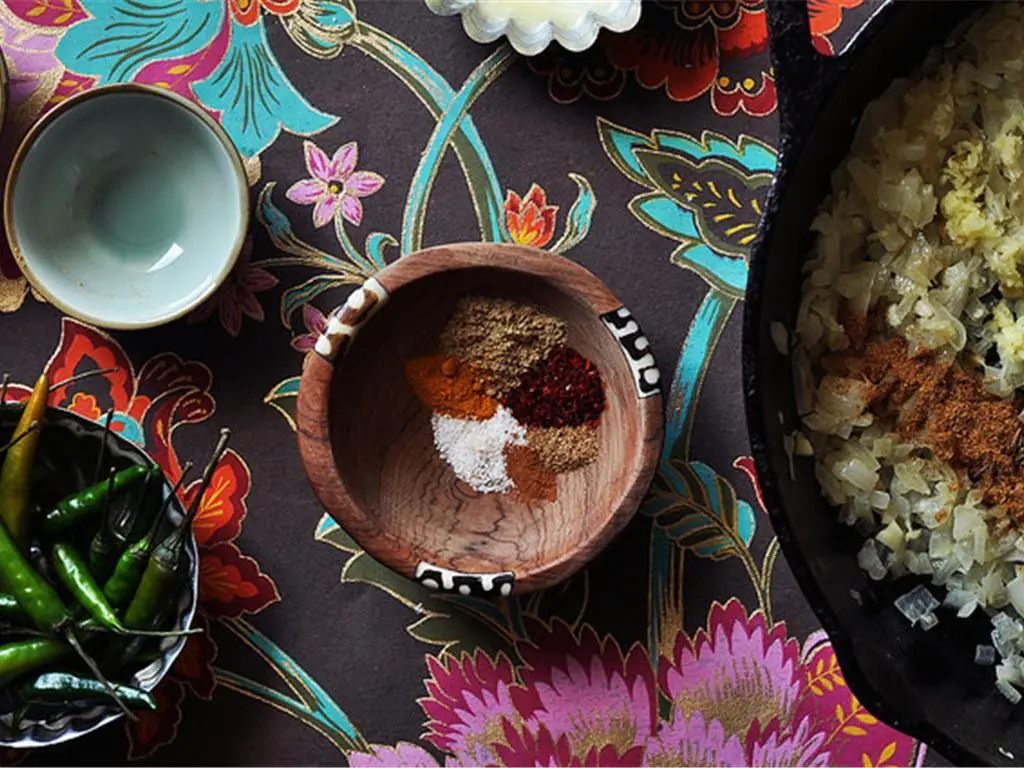 Add the Fresh Ginger (2 tsp), Garam Masala (2 tsp), Cumin Seeds (1/2 tsp), Salt (1/2 tsp), Ground Black Pepper (1/2 tsp), Chili Powder (1/2 tsp), Ground Turmeric (1/2 tsp), Mango Powder (1/2 tsp), Simply Organic Cinnamon, Ground (1/4 tsp), and Ground Coriander (1/4 tsp).