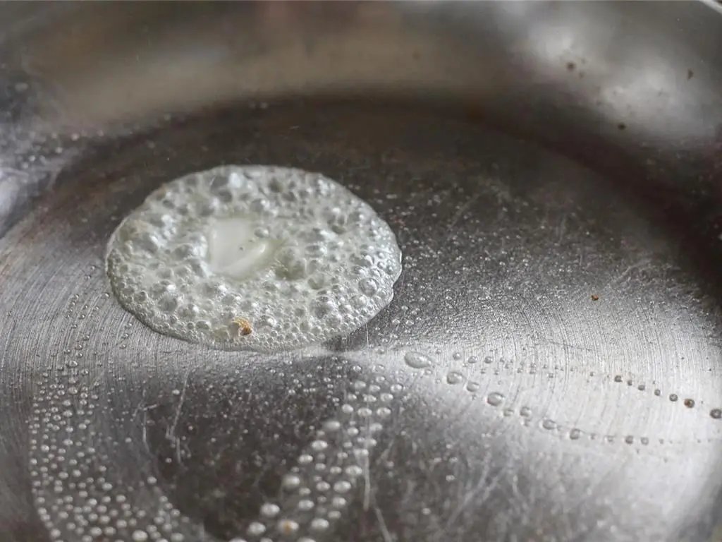 Once the butter is melted, use a spatula to rub it evenly throughout the pan. This creates a nice, non-stick surface of a non-teflon pan.