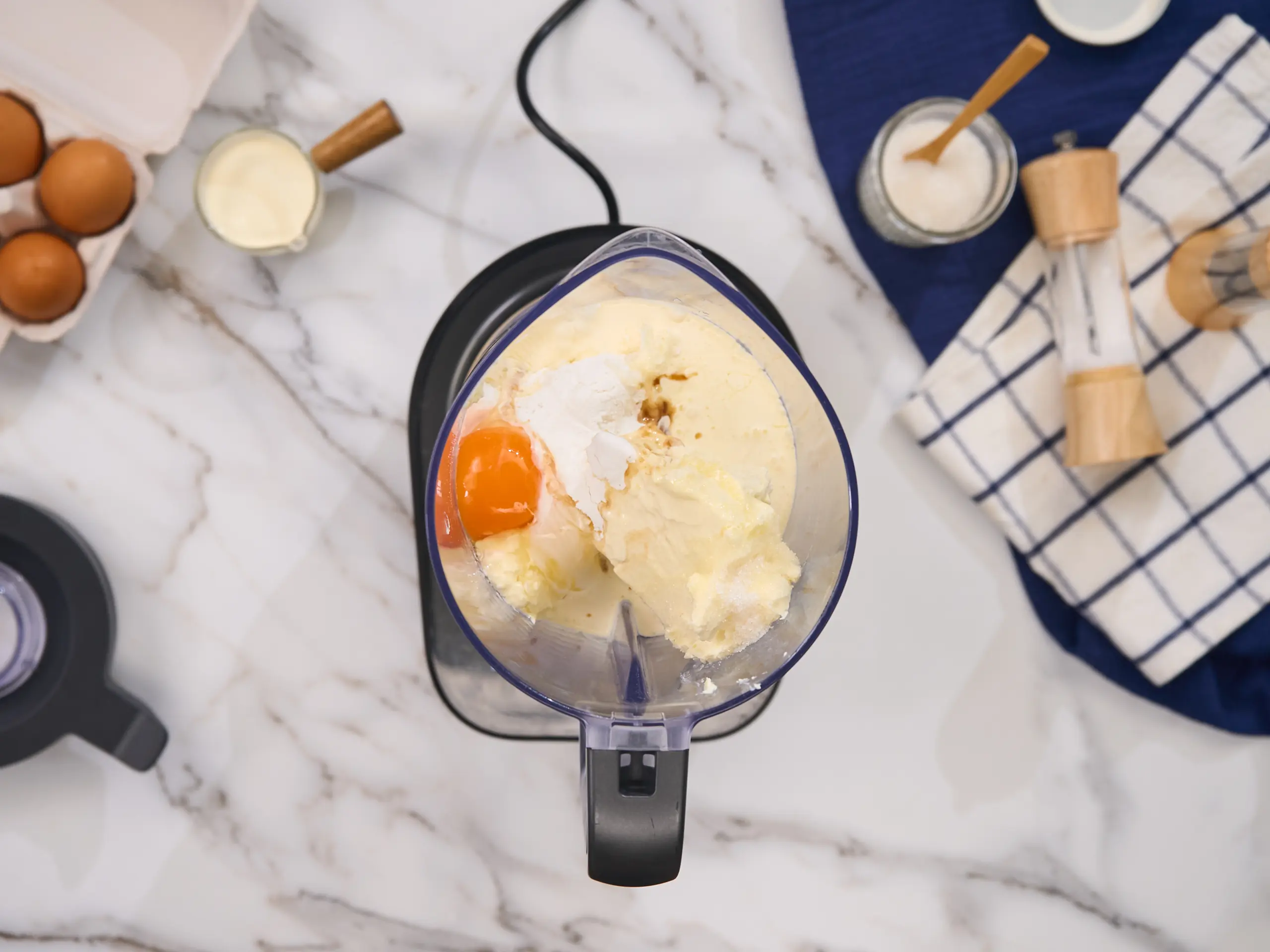 Into the blender, add Cream Cheese (2 cups), Granulated Sugar (1/2 cup), Cake Flour (2 Tbsp), Farmhouse Eggs® Large Brown Eggs (4), Heavy Cream (1 cup), and Vanilla Extract (1/4 tsp). Blend until smooth.