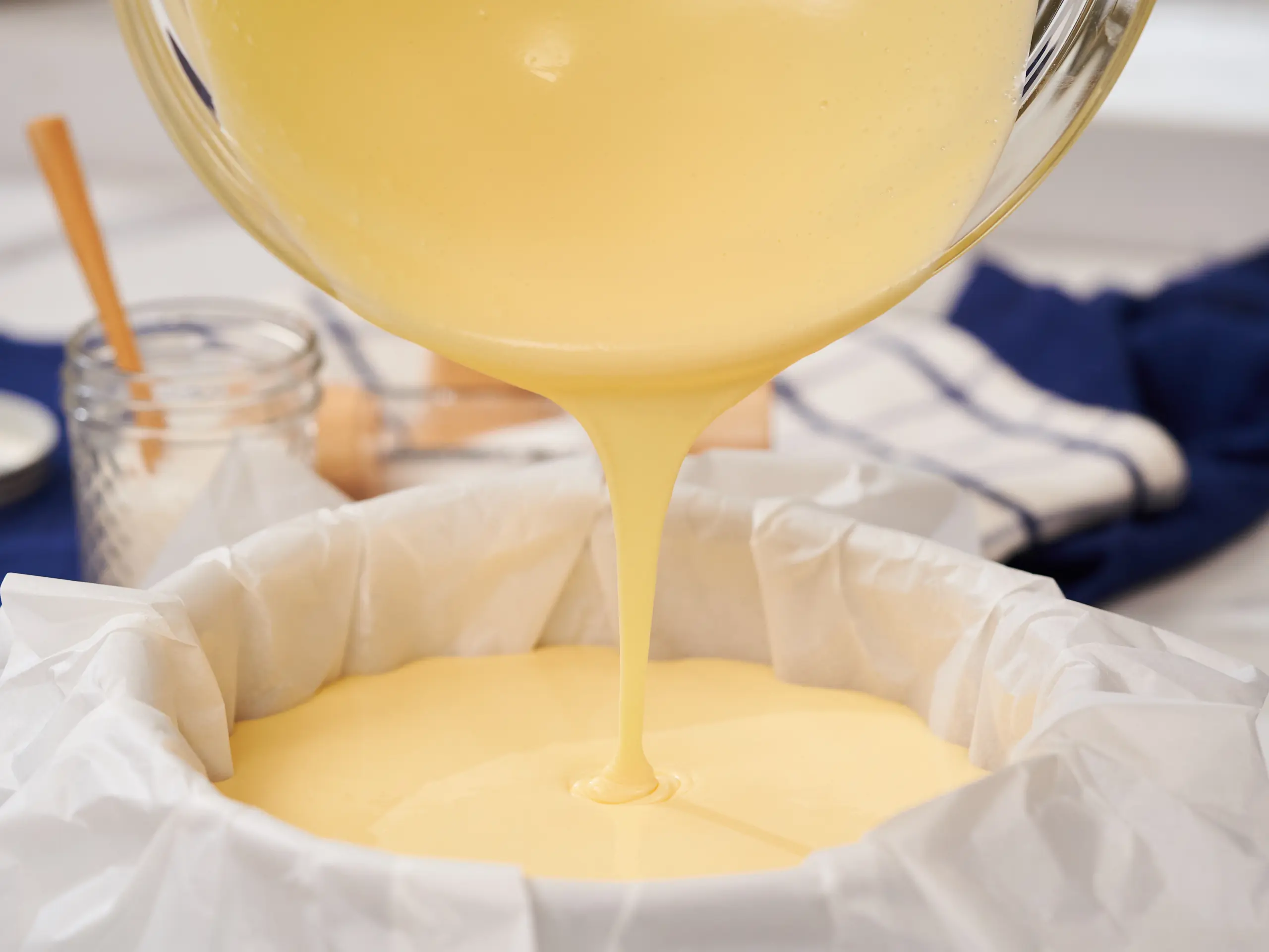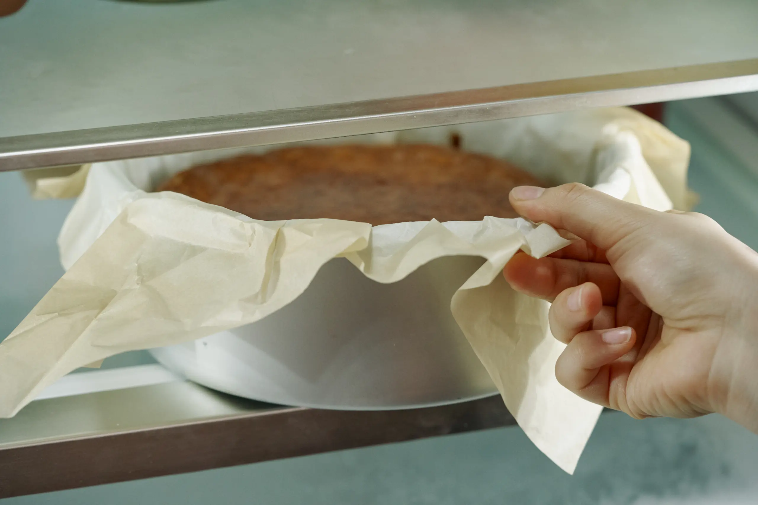Line a cake tin with baking paper, and make sure that the parchment paper is higher than the edge of the cake tin. If your parchment paper isn’t wide enough, line it with two sheets of paper.