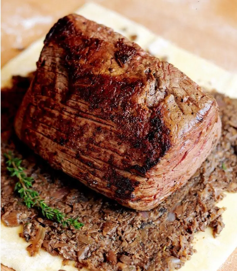 Spread mushroom mixture onto pastry dough, leaving a 1/2-inch border around edge of dough. Place roast in center of mushrooms. Fold pastry neatly around the roast, stretching dough if necessary. Tug in the excess pastry under the roast.
