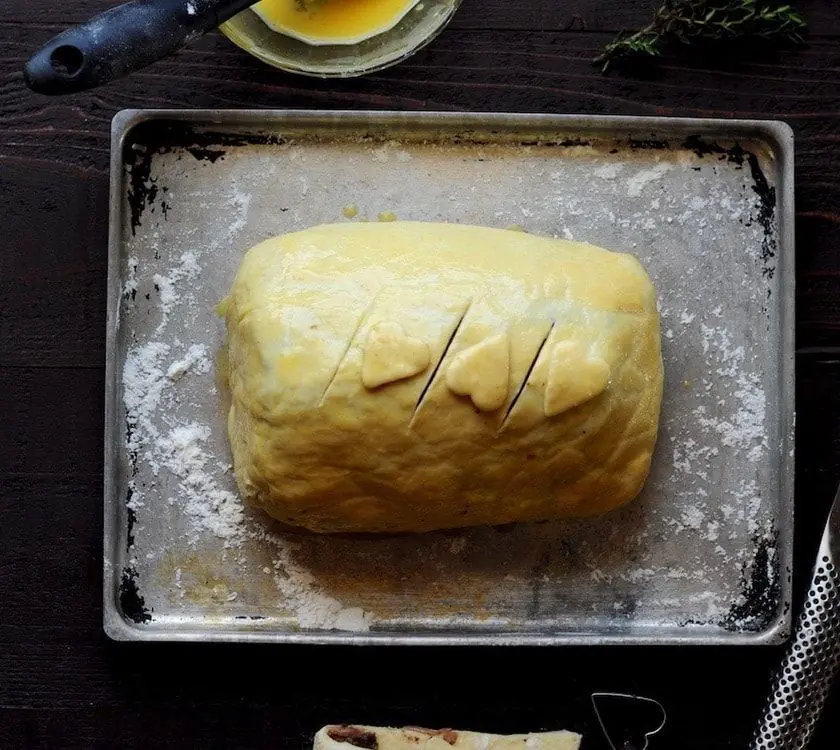 Dust a baking sheet lightly with flour. Place pastry-wrapped roast, seam-side down, on the baking sheet, and brush the top and sides with the egg. Cut 3-4 two-inch vents in the top of the pastry. Decorate with heart-shaped pastry cuttings if desired.