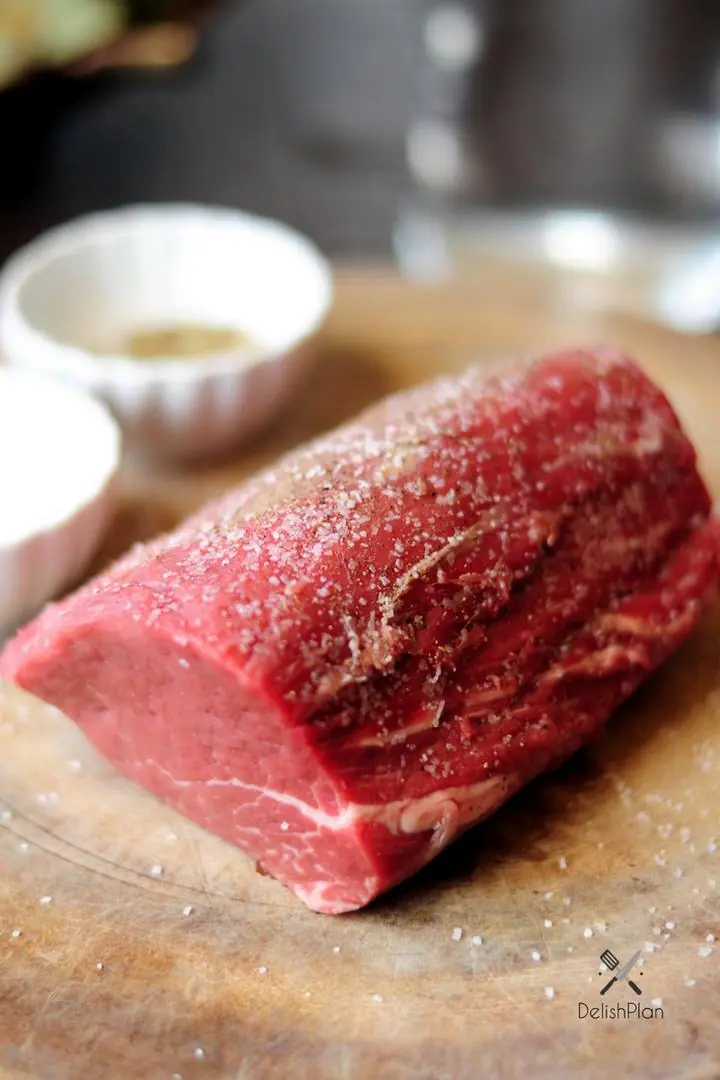 Season Center-Cut Beef Tenderloin (1) with Salt (to taste) and Ground Black Pepper (to taste). Press evenly onto all surfaces of beef roast.