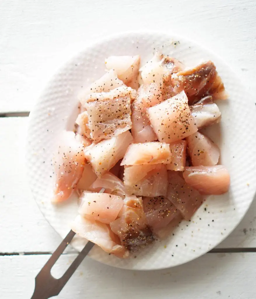 Cut Cod Fillets (4) into bite size pieces then sprinkle with Salt (to taste) and Ground Black Pepper (to taste).