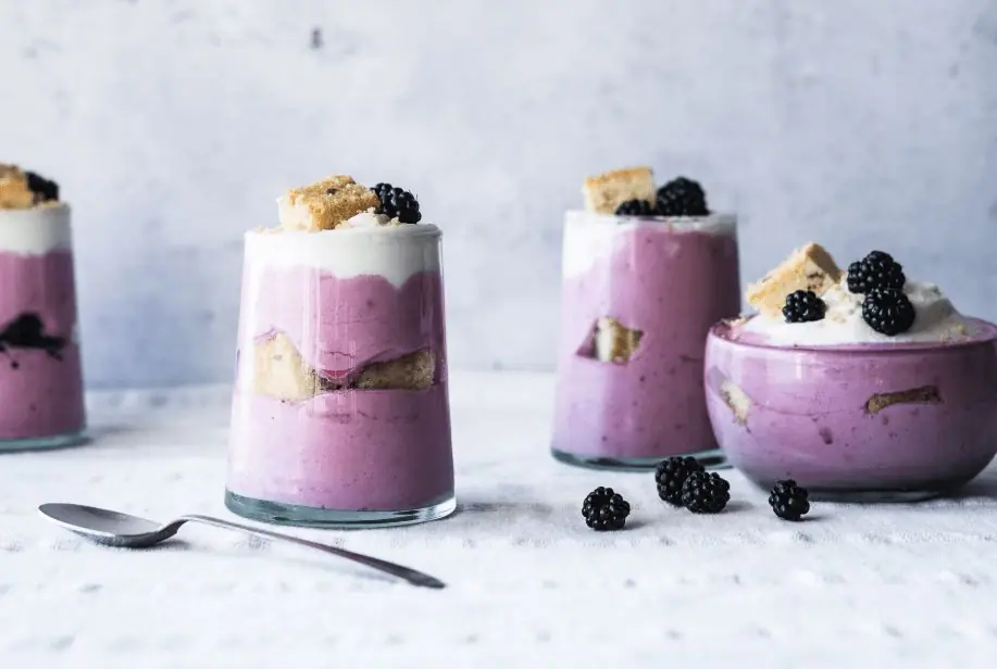 Building the trifles is free form; you can do it in any order you like. I started with the blackberry yogurt mixture, followed by a layer of shortbread, another layer of blackberry yogurt and finally a bit of the plain yogurt cream on top with a garnish of shortbread and fresh blackberries.