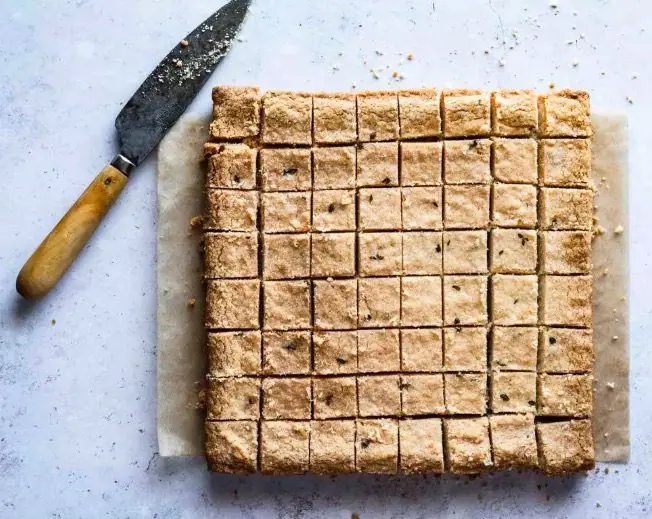 Remove from the oven and let the shortbread cool for 15 minutes in the pan before carefully transferring it out and onto a wire rack. Slice the shortbread into even squares while it is still warm.