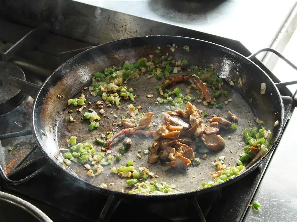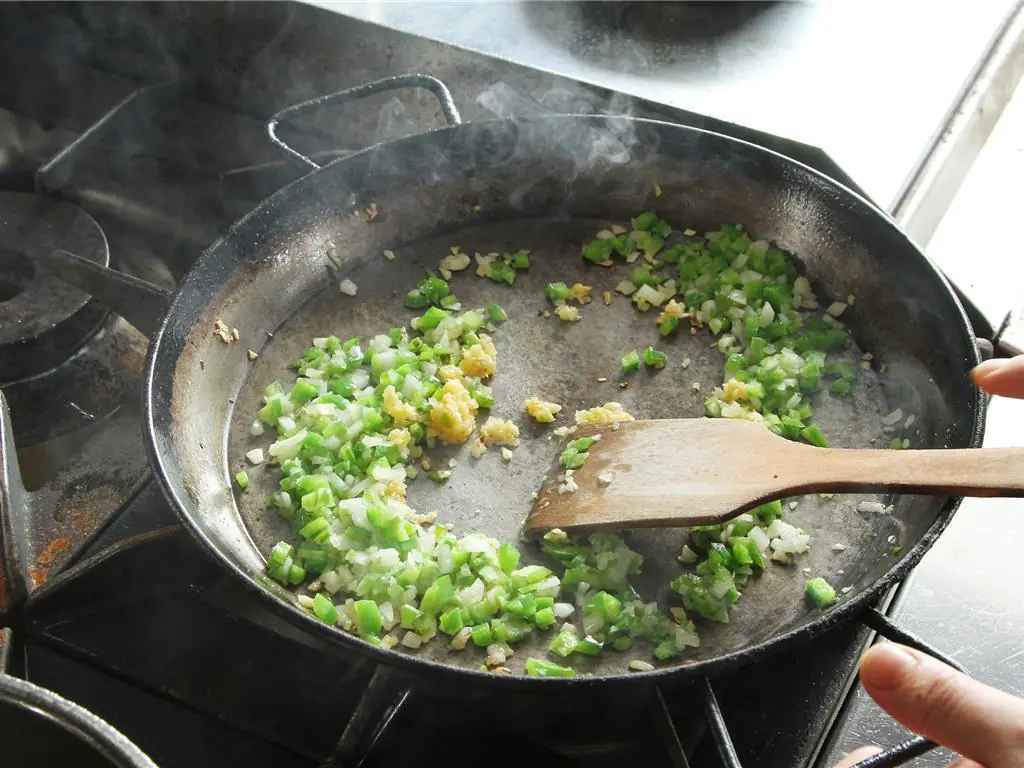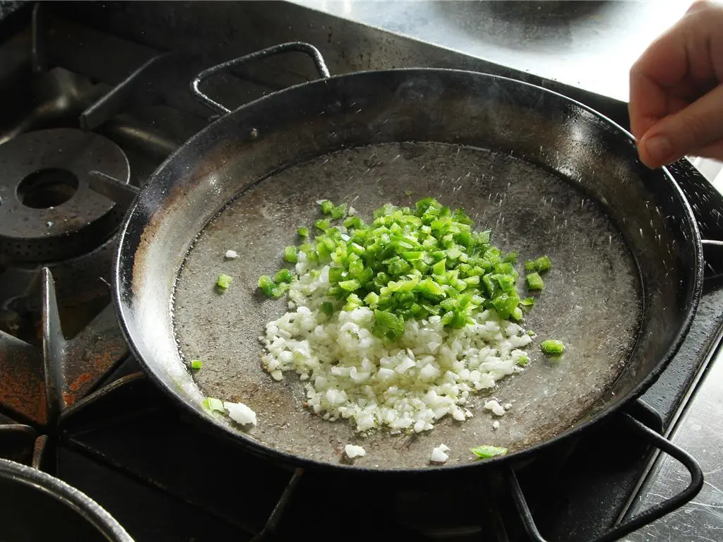 On a paella pan over medium high heat, add Olive Oil (3 Tbsp), diced green peppers, and onions. Season with Salt (to taste) to release the natural juices and cook until translucent.