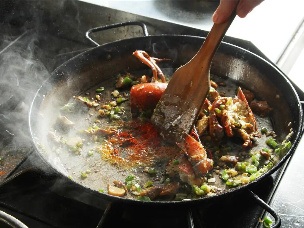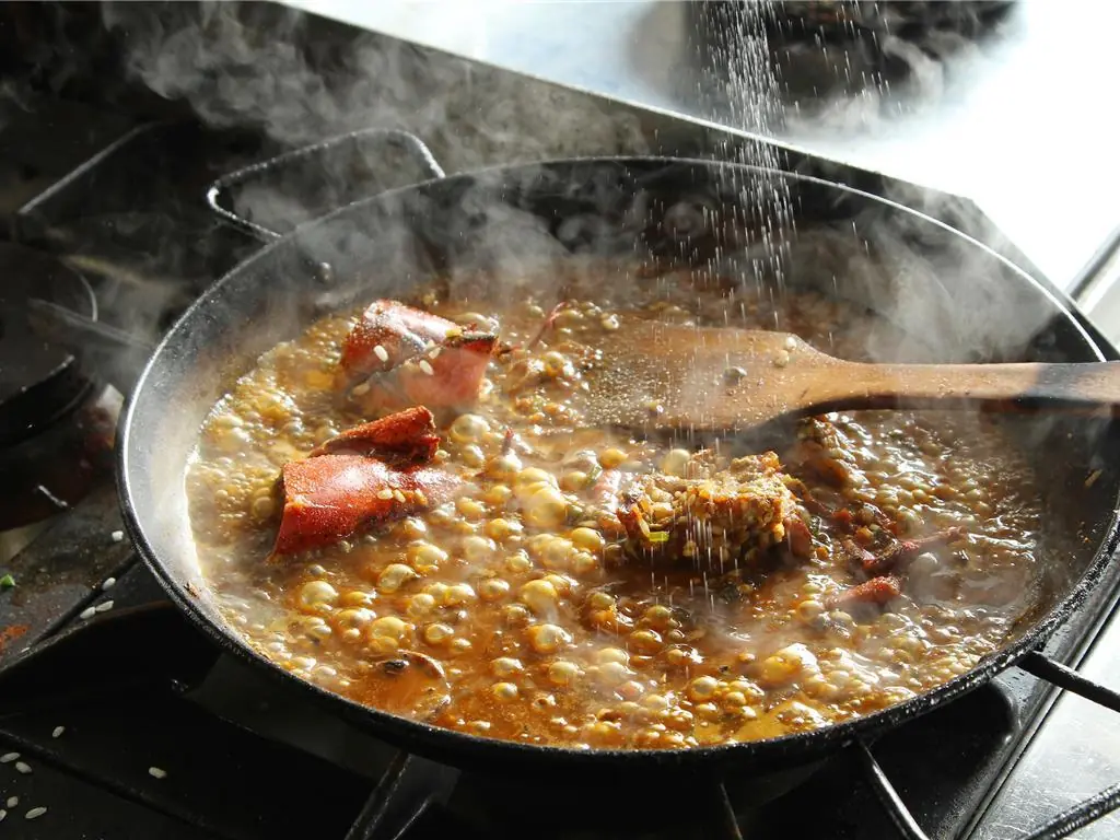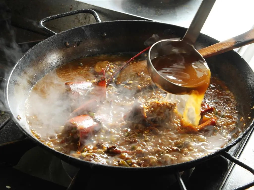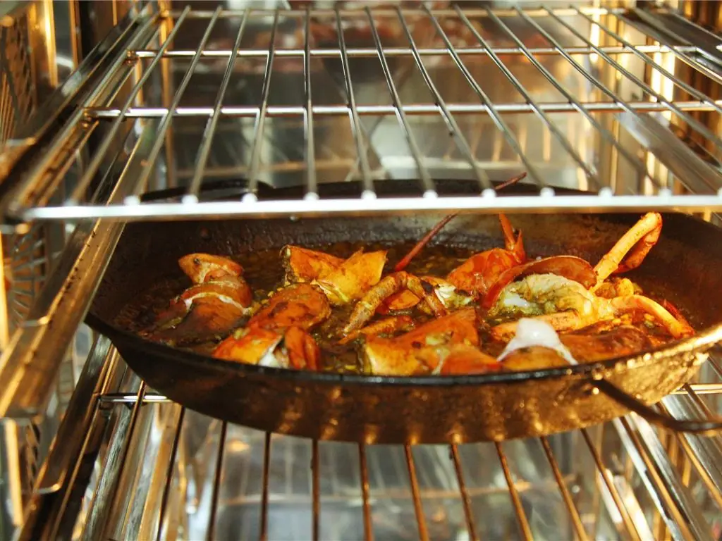 Transfer the lobster back in the paella. Once almost dry, add some more lobster stock and place in a 350 degrees F (180 degrees C) oven for 5 minutes. Check the cooking point of the rice, it needs to be al dente.