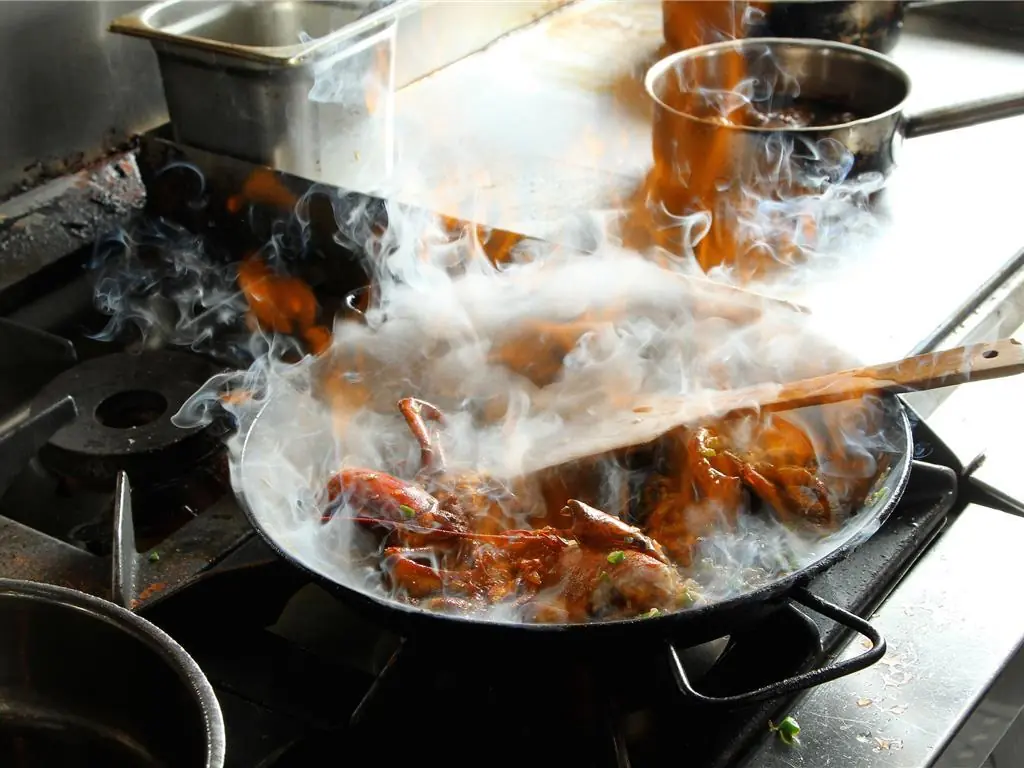 Add the lobster and cook it until the juices are released. Once the lobster is nicely seared. Remove the pieces from the pan, but keep the head.