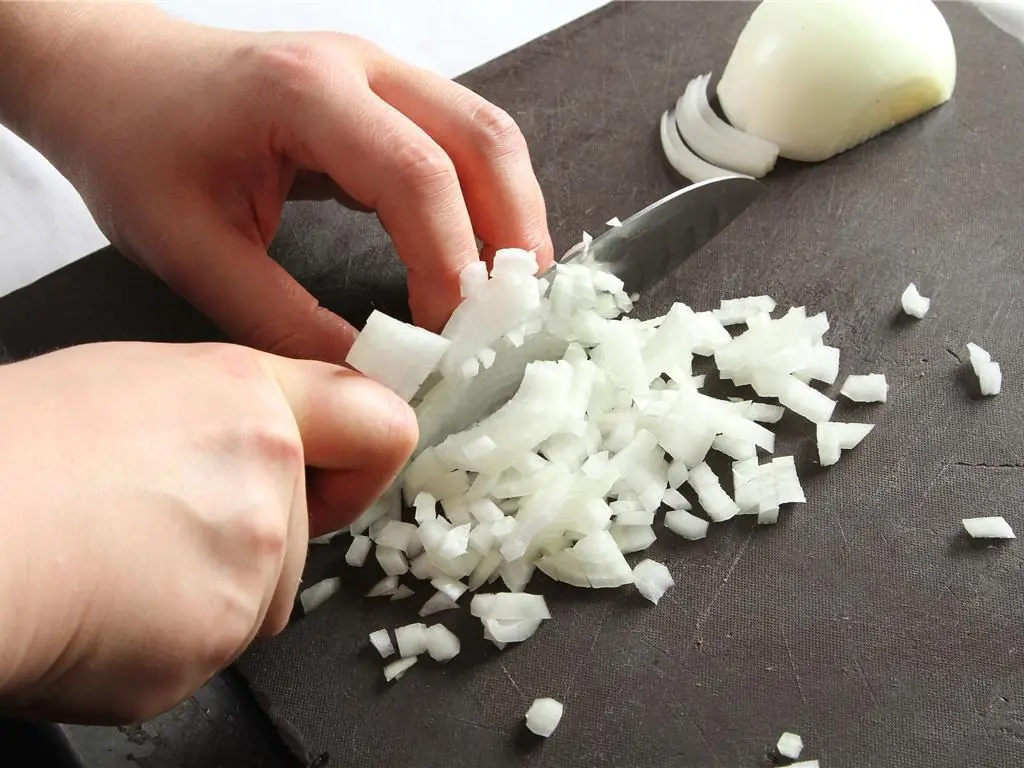 Dice the Yellow Onion (1/2 cup), Green Bell Pepper (1/3 cup) and mince the Garlic (1 clove).