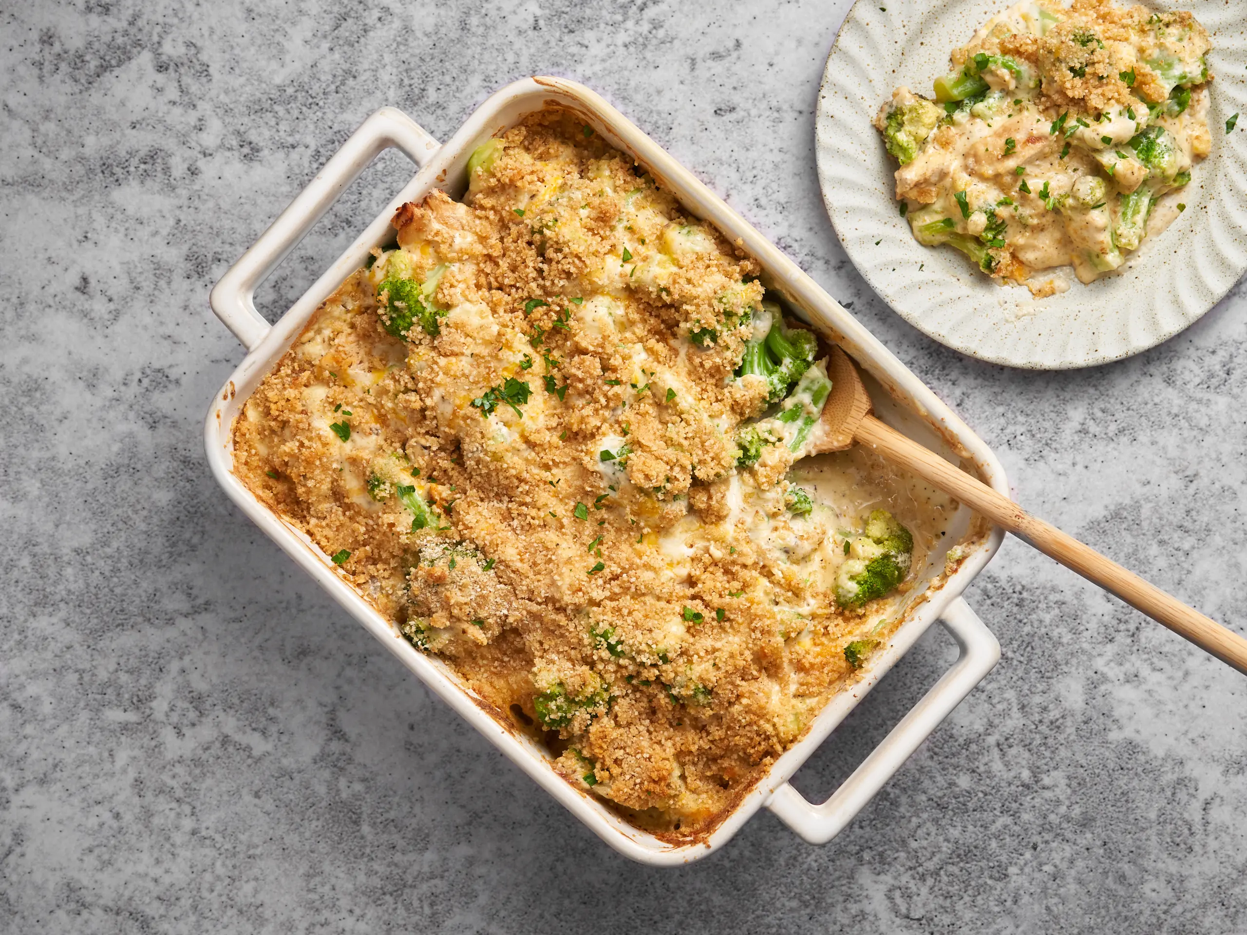 In the same bowl, add the Chicken Breast (1 lb) and Birds Eye® Steamfresh® Selects Broccoli Cuts (2 1/2 cups) and stir until well coated. Transfer to the prepared baking dish, then sprinkle the breadcrumb mixture and the rest of the Shredded Triple Cheddar Cheese Blend (3/4 cup) on top.