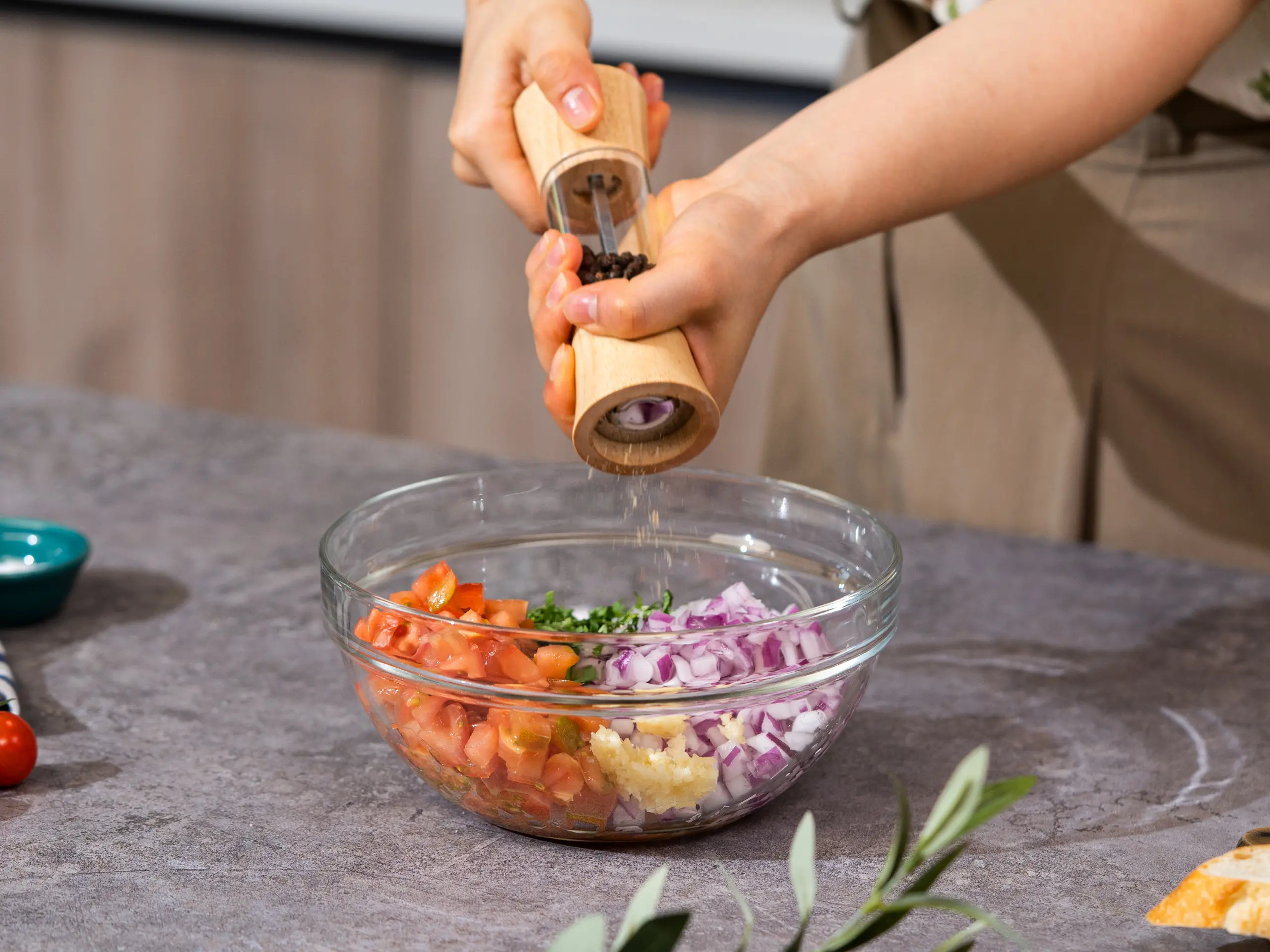 Make the bruschetta by mixing Tomatoes (1 1/2 cups), Red Onion (1/2), Garlic (2 cloves), Fresh Basil (4 Tbsp), and Olive Oil (2 Tbsp) in a medium bowl. Season with Salt (to taste) and Ground Black Pepper (to taste). Set aside in the fridge.