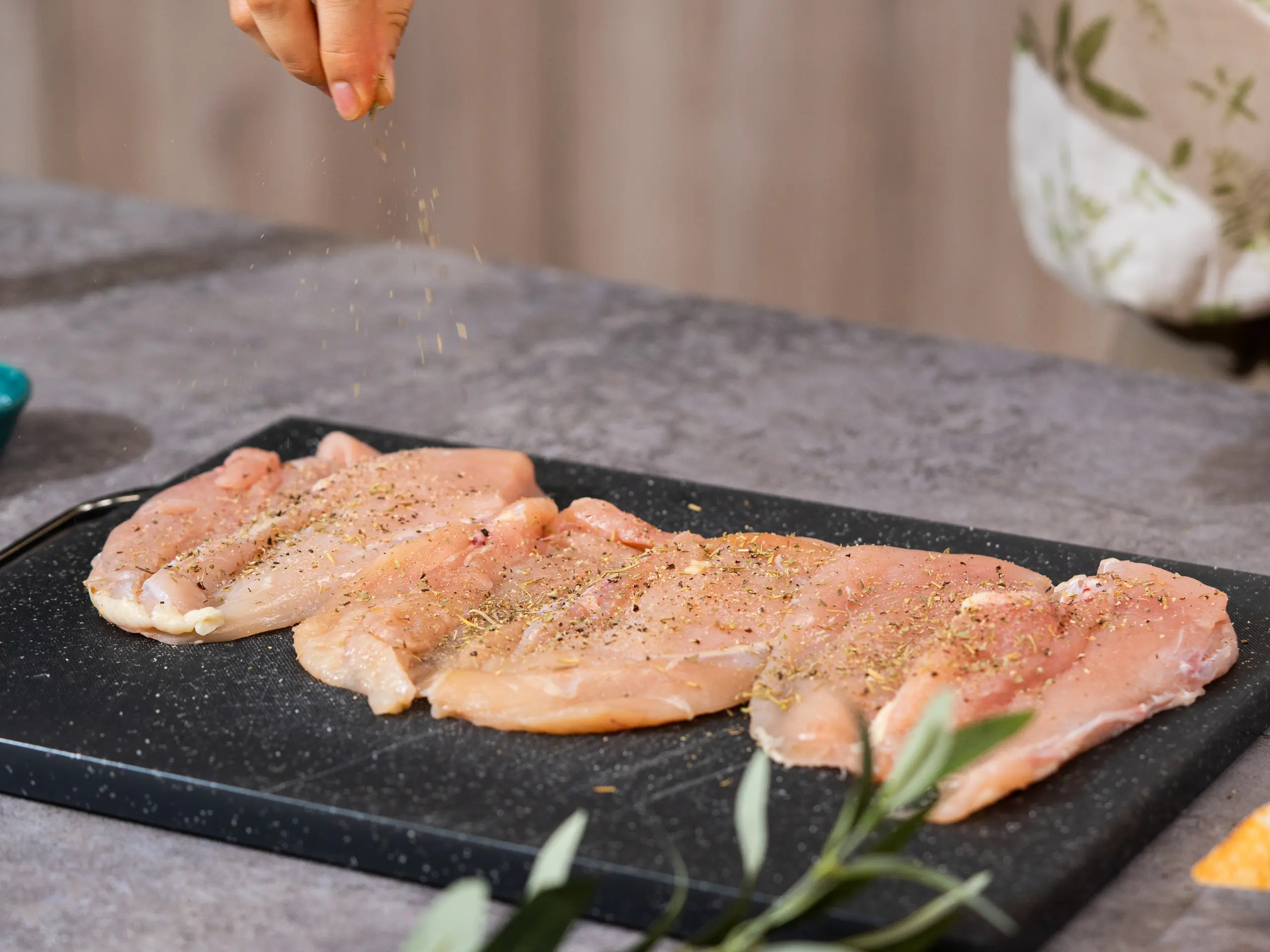 Butterfly the Boneless, Skinless Chicken Breasts (3). Season with Italian Seasoning (1 tsp), Salt (to taste), and Ground Black Pepper (to taste) on both sides.