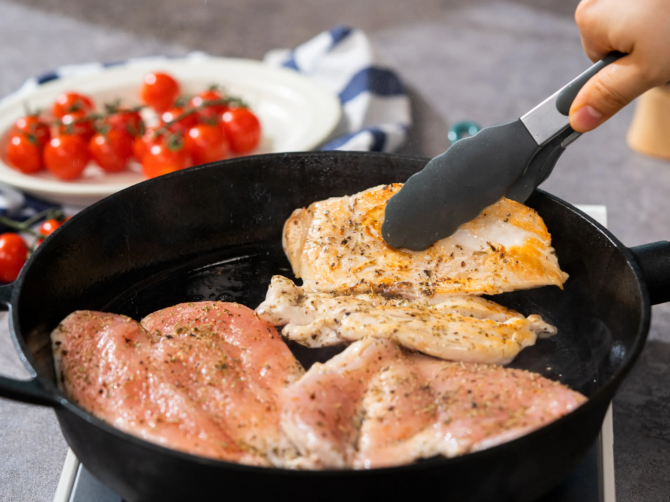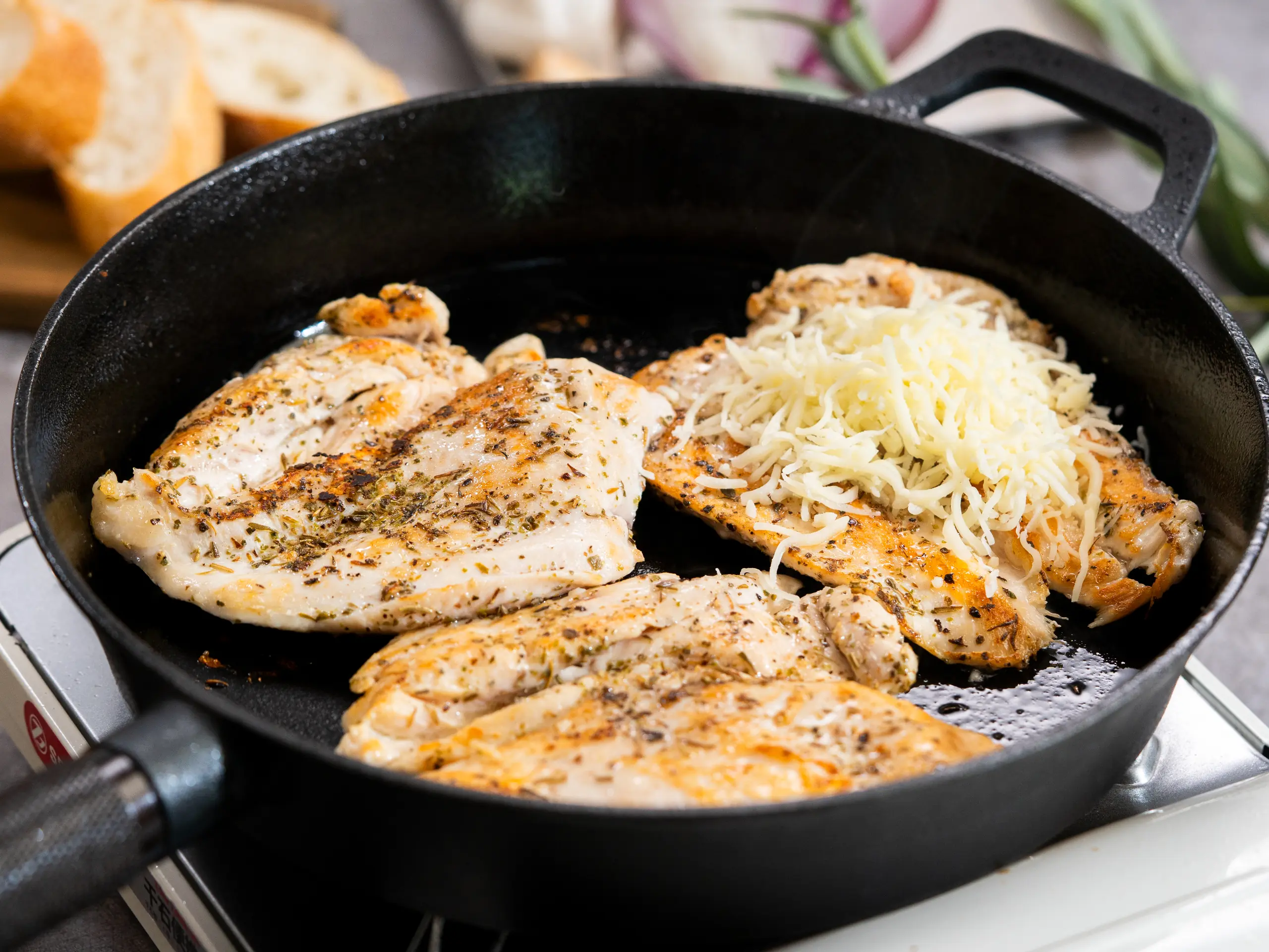 Flip the chicken and top each piece of chicken with Shredded Mozzarella Cheese (1 cup). Cover with a lid and cook for 1-2 minutes until the cheese is melted. Remove from the heat.