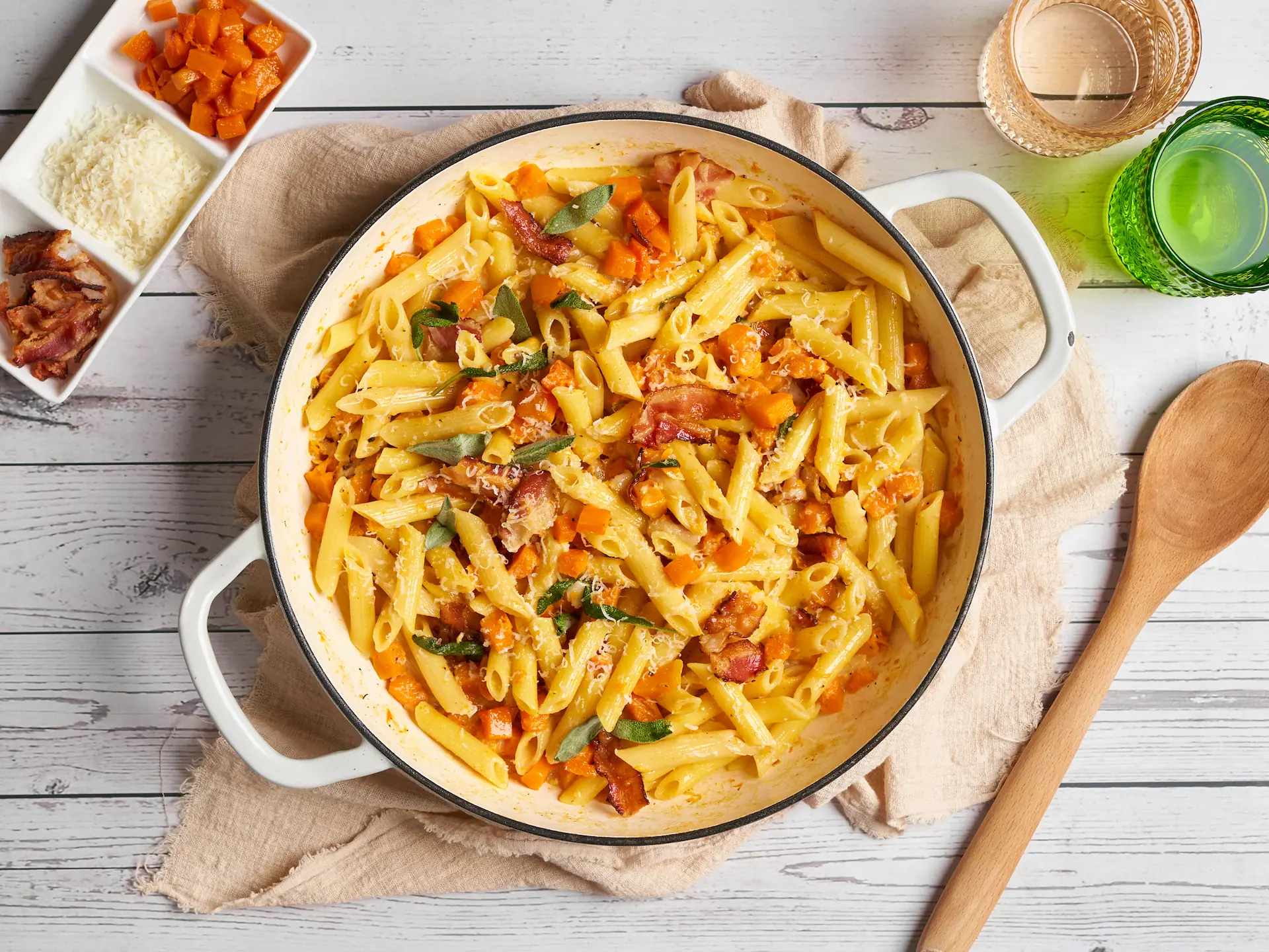 Dive into fall with this cozy butternut squash delight! Roasted squash, crispy bacon, and sage mingle in creamy goodness. Penne perfection topped with Parmesan, a hint of chili, and a sprinkle of salt. A warm, seasonal hug for your taste buds.