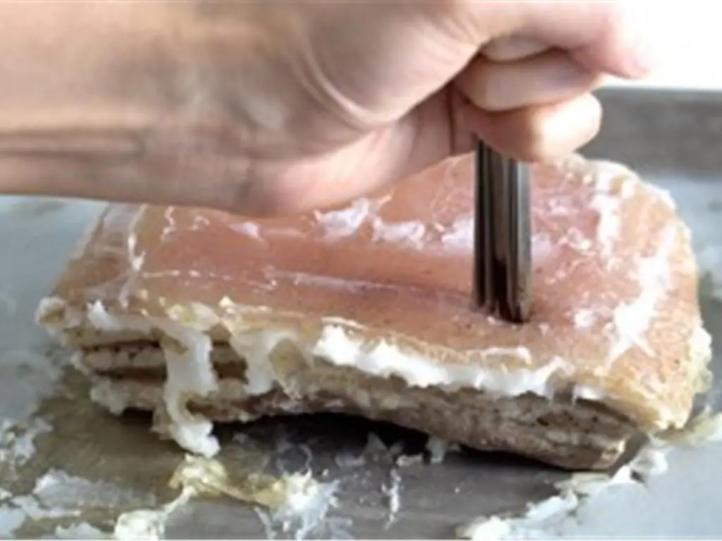 Then grab a big handful of wooden or metal skewers, evenly and thoroughly, make tiny punctures through the skin down the top layer of fat. Instead of random jabbing, move systematically from left to right/top to bottom.
