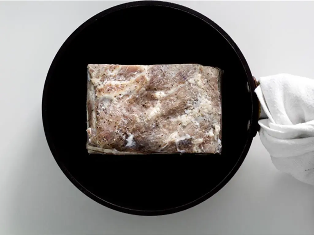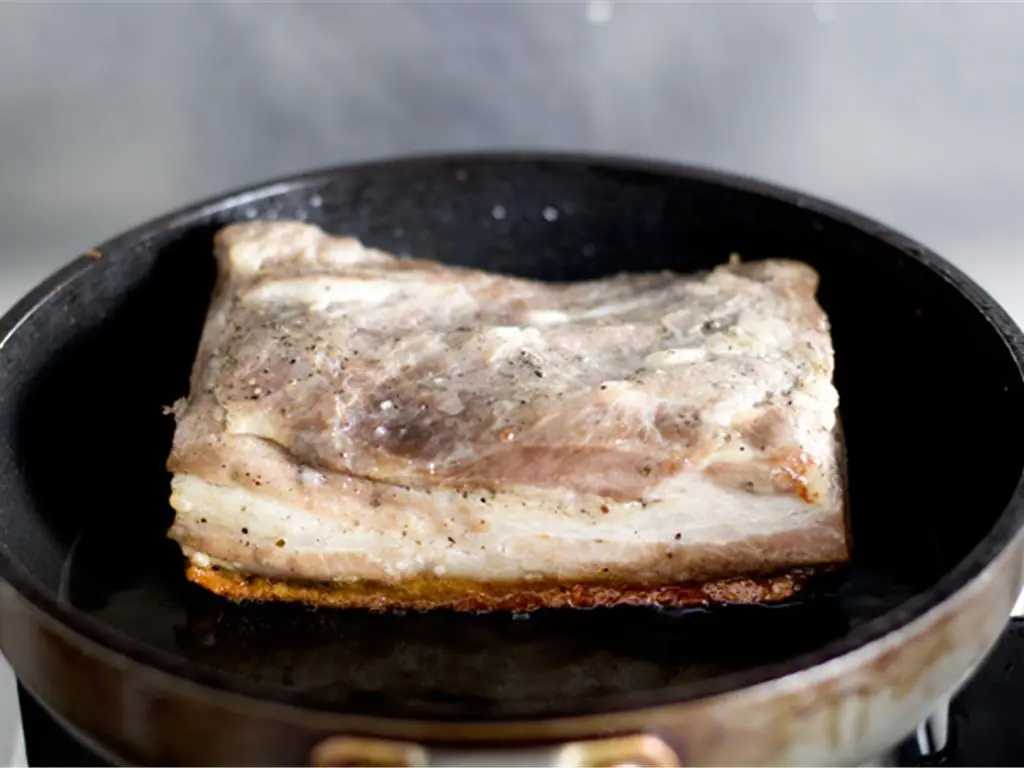 Heat a non-stick skillet over medium-high heat, then place the belly skin-side down in the center of the skillet.