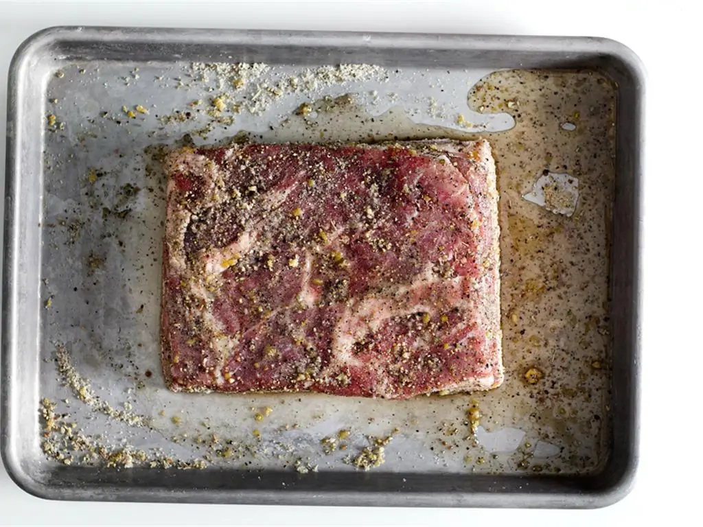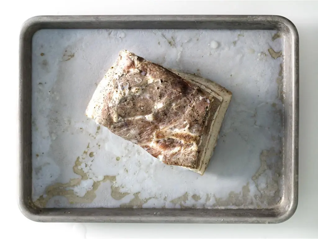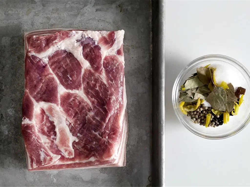 Place the slab of Skin-On Pork Belly (1 piece) in a baking-sheet. Pork belly should be roughly 8 × 8-inches (can be a square or rectangle). Rub the salt-mixture evenly on all sides of the pork belly.