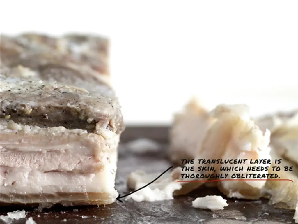 Look at the cut-side and get familiar with the anatomy of the belly. The skin is a very obviously translucent and darker layer apart from the white, opaque fat-layer underneath.