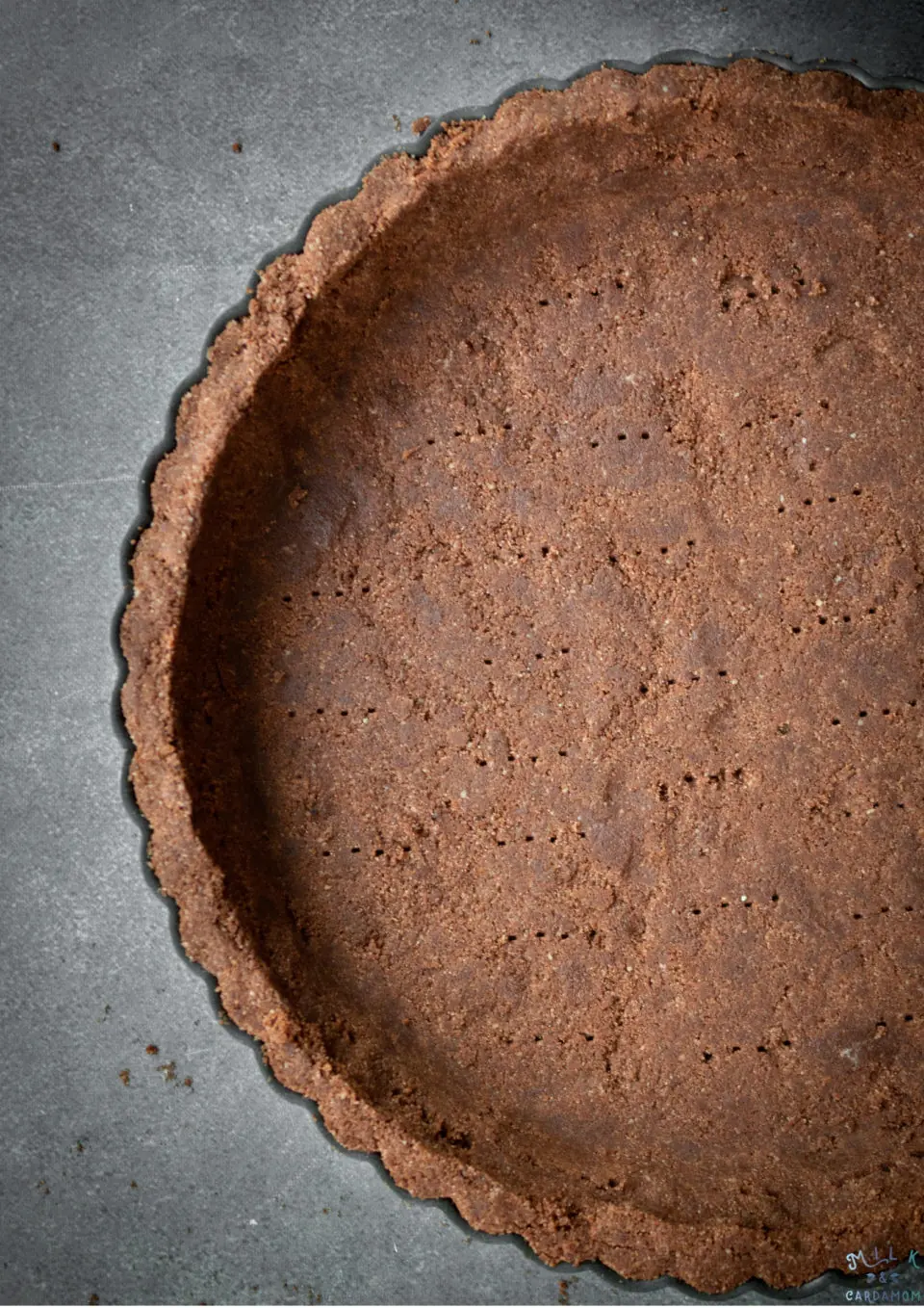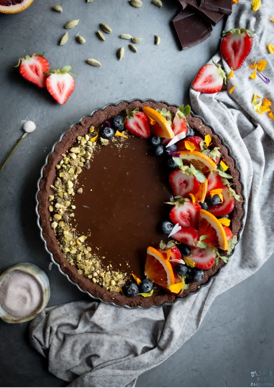 Start with a simple salted chocolate shortbread crust, then fill it with a dark chocolate ganache made with coffee and cardamom-infused heavy cream. Decorate with your favorite berries and nuts.