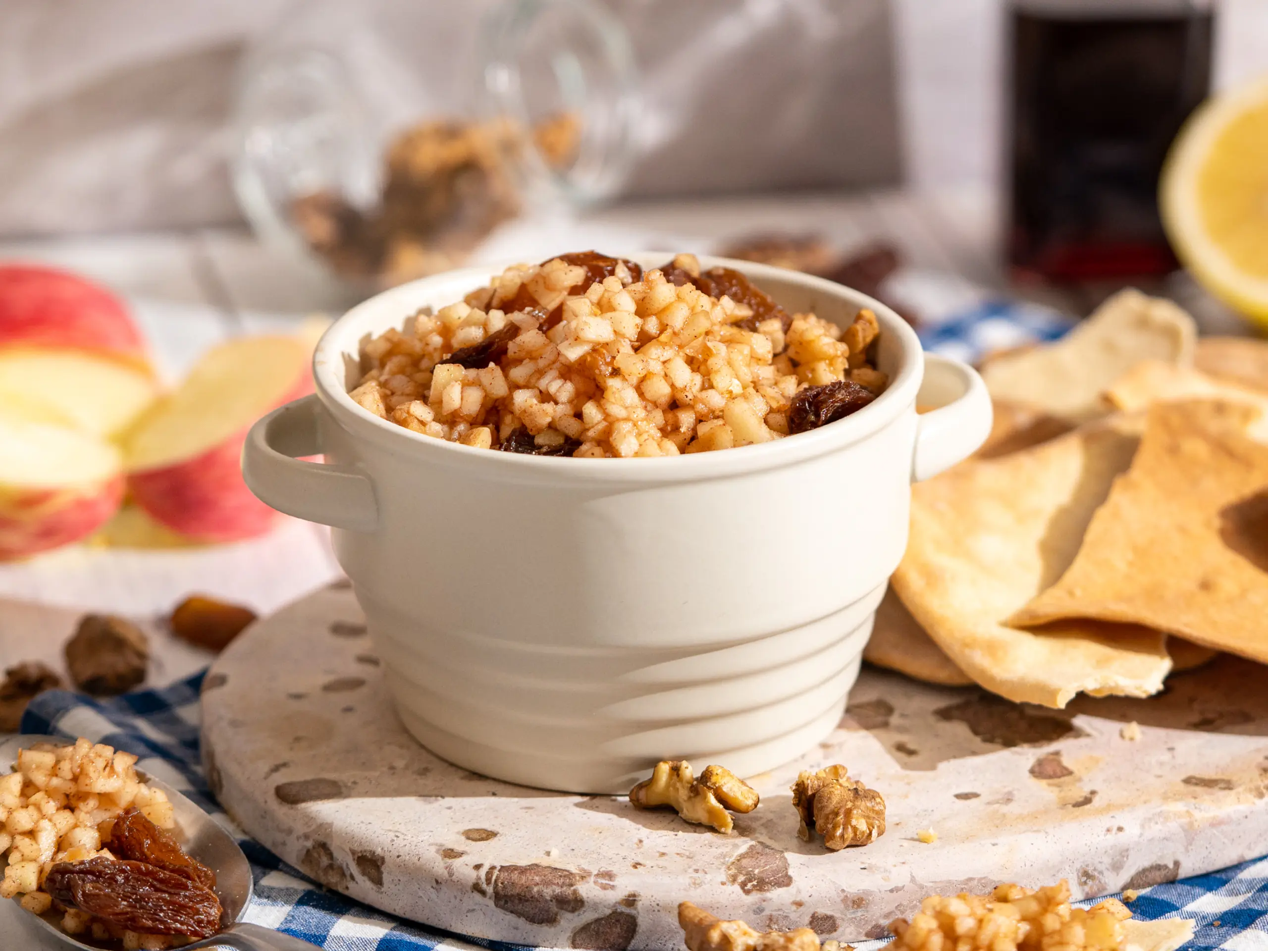 Charoset is the sign of the Passover Seder. An easy combination of fresh apples, nuts, spices, and wine. Adding a granny smith apple gives an extra tartness to balance the sweetness from the honey, wine, and cinnamon, while walnuts add a variation in texture. A crunchy, sweet, and refreshing dish that can be enjoyed all year long.