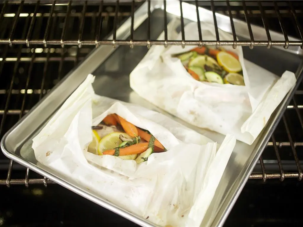 Add White Cooking Wine (4 Tbsp) and 2 teaspoon of Olive Oil (2 tsp). Bring the edges of the parchment paper to the center and fold together tightly. Place packets on a sheet pan.