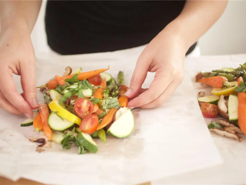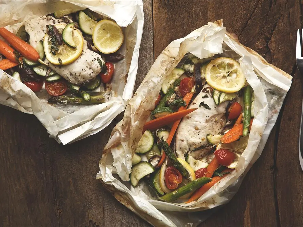The French technique of cooking “in paper” gently steams your protein and veggies in liquid—wine, in this case—so barely any cooking fat is necessary. Our other favorite part? How easy it is to pack a ton of veggies into this one-dish wonder with minimal prep work or clean up.