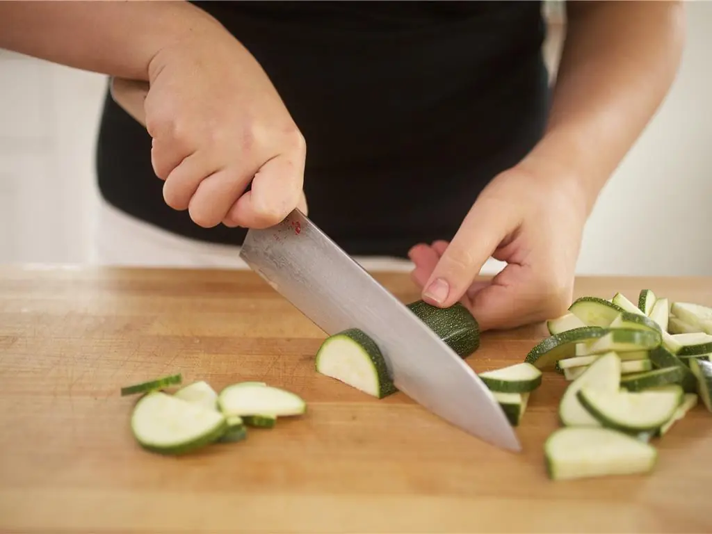 Cut only half of the Cherry Tomato (1/2 cup) in half. Slice Zucchini (1/2) in half lengthwise then slice across into half moons. Set aside.