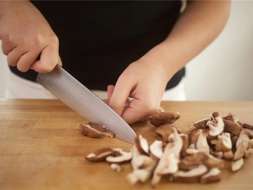 Remove stems from Shiitake Mushroom (1 cup). Slice into 1/2 inch pieces. Slice French Baby Carrots (6) in half lengthwise. Slice the Lemon (1) into 1/4 inch rounds. Set aside.