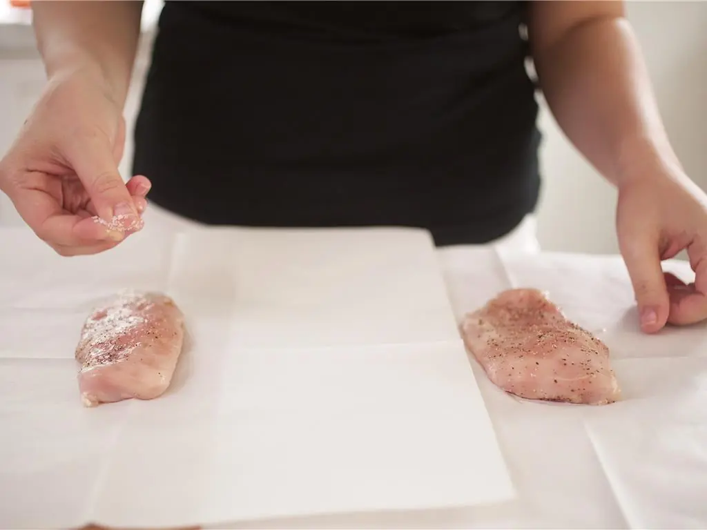 Place 1 chicken breast in the center of each piece of parchment paper.