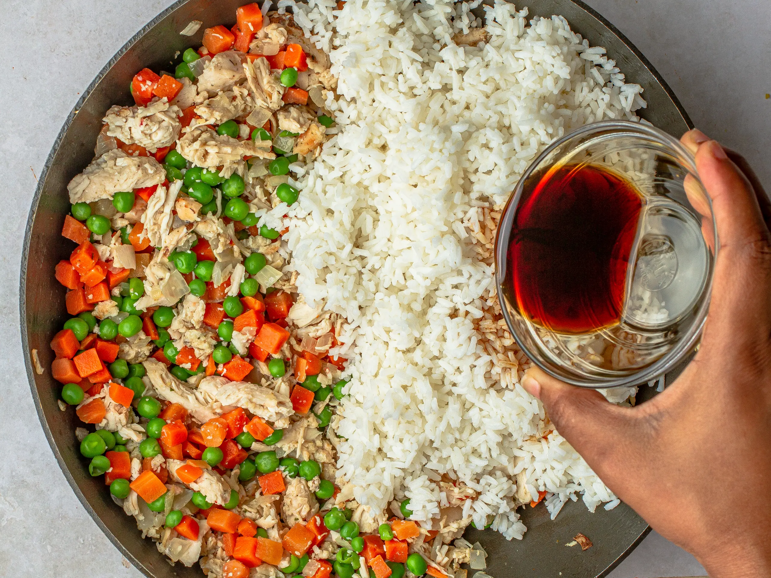 Fold in the cooked White Rice (1 1/3 cups) and Light Soy Sauce (1/3 cup) and cook for 2 minutes or until the liquid evaporates.